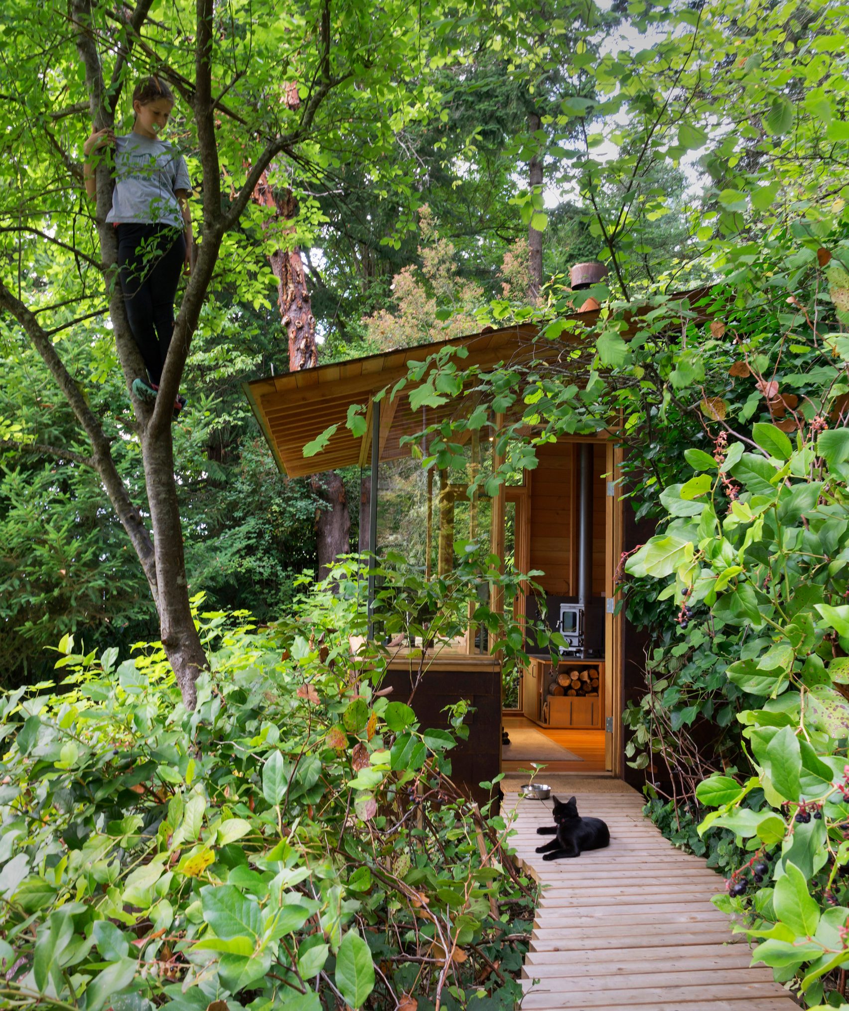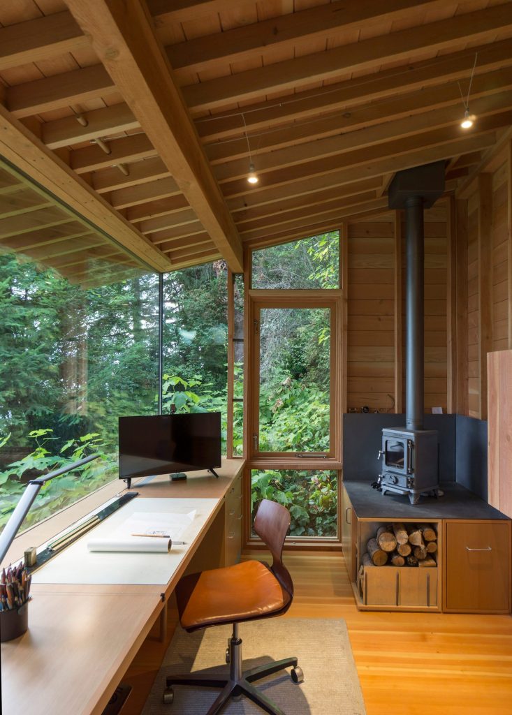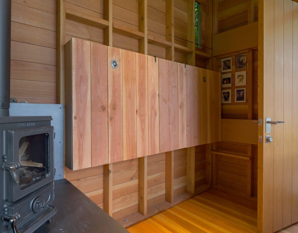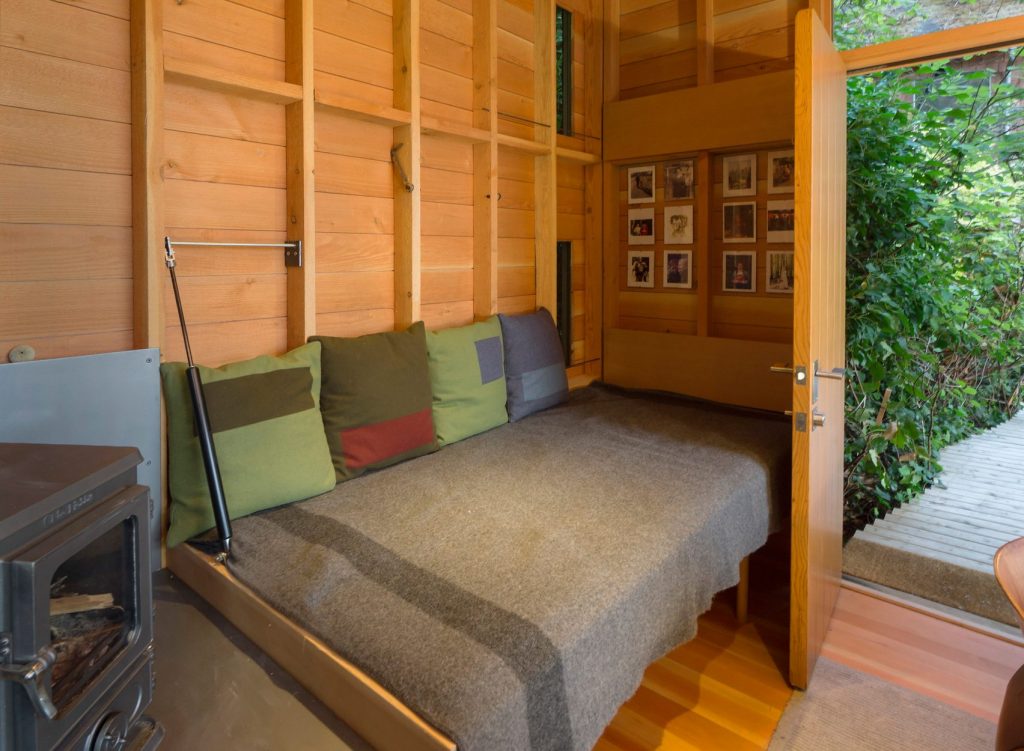 A házhoz csatolt, csupán, 7,5 négyzetméteres fabunker nap közben gyakran az apuka munkaállomása, estére pedig sokszor a fiatal, 12 éves lány hív át barátnőket ottalvós estére a kis házba. Szóval tökéletes kis csatolmány lett, gyerekkorunkban mi is imádtunk volna ilyen házikóban (rém)meséket mondani zseblámpával.