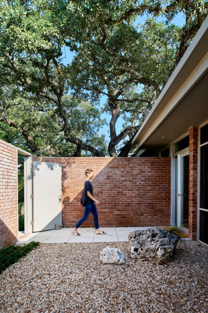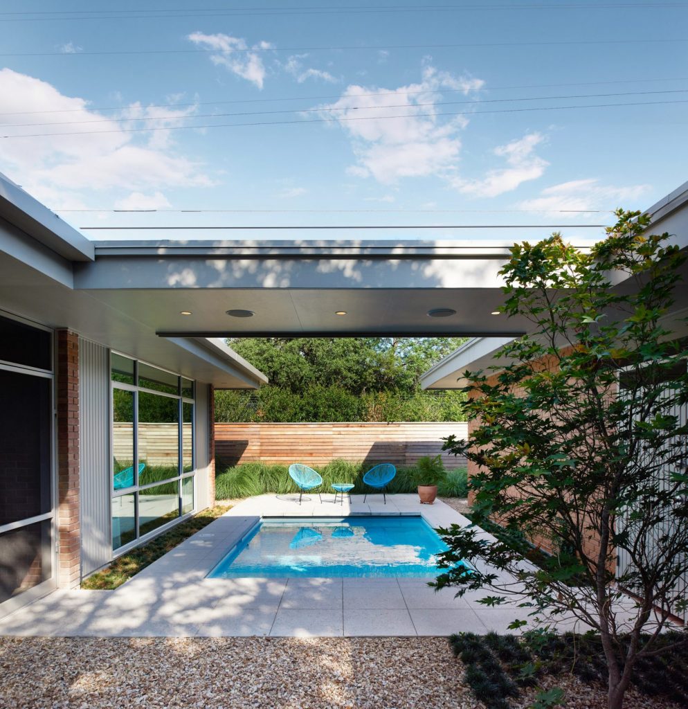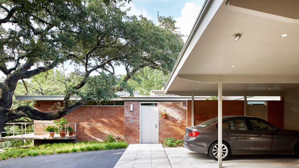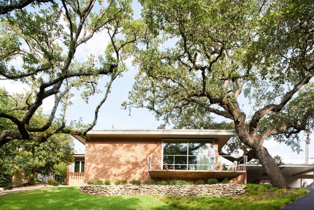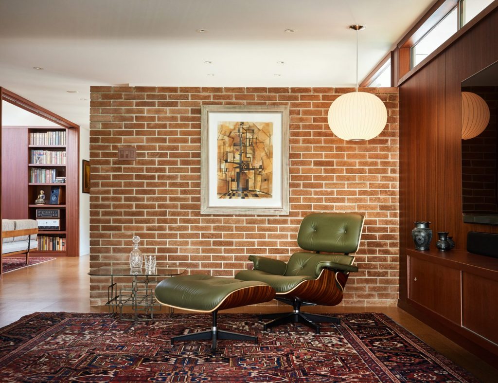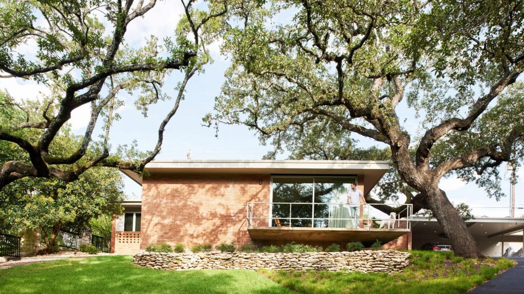 A 165 négyzetméteres, kétszobás, medencés ház egy domboldalon épült Austinban még az 1950-es években – új tulajdonosai pedig nagyon szerették volna, hogy a felújításkor minden régi karakter megmaradjon. Így a mahagóni-oszlopok és a téglafalak is maradtak, a dizájnban pedig érződik a modernista éra szerelme is. Meg persze olyan részletek is felbukkannak, mint az ikonikus Eames-fotel.