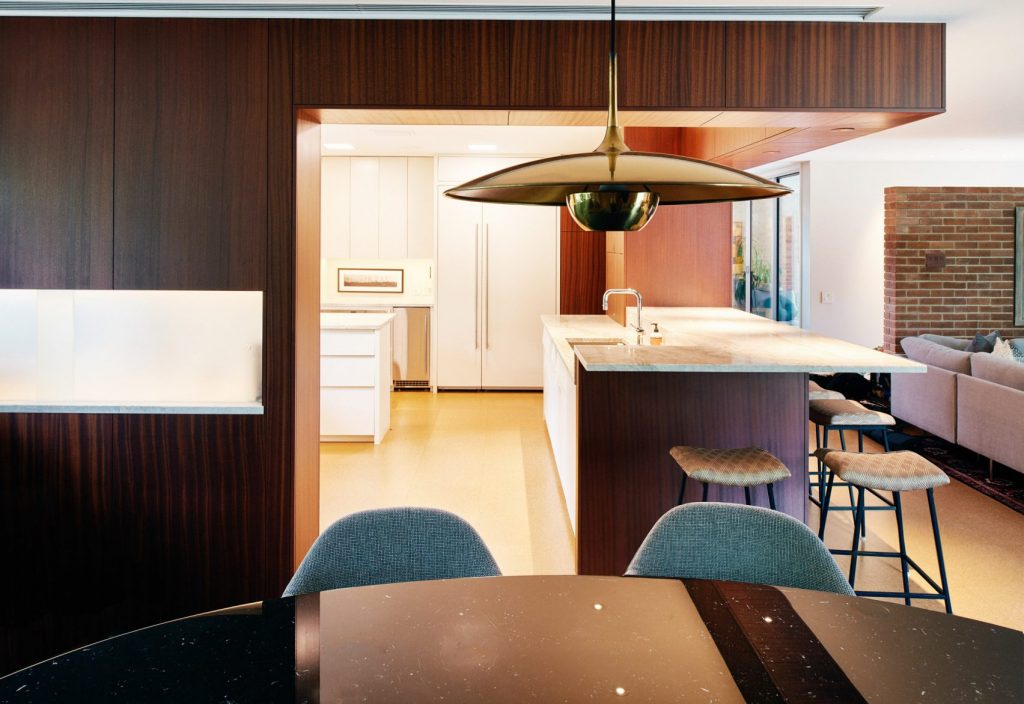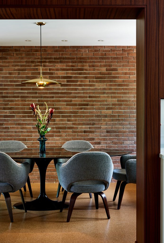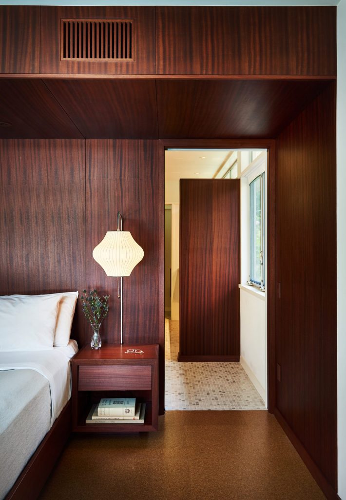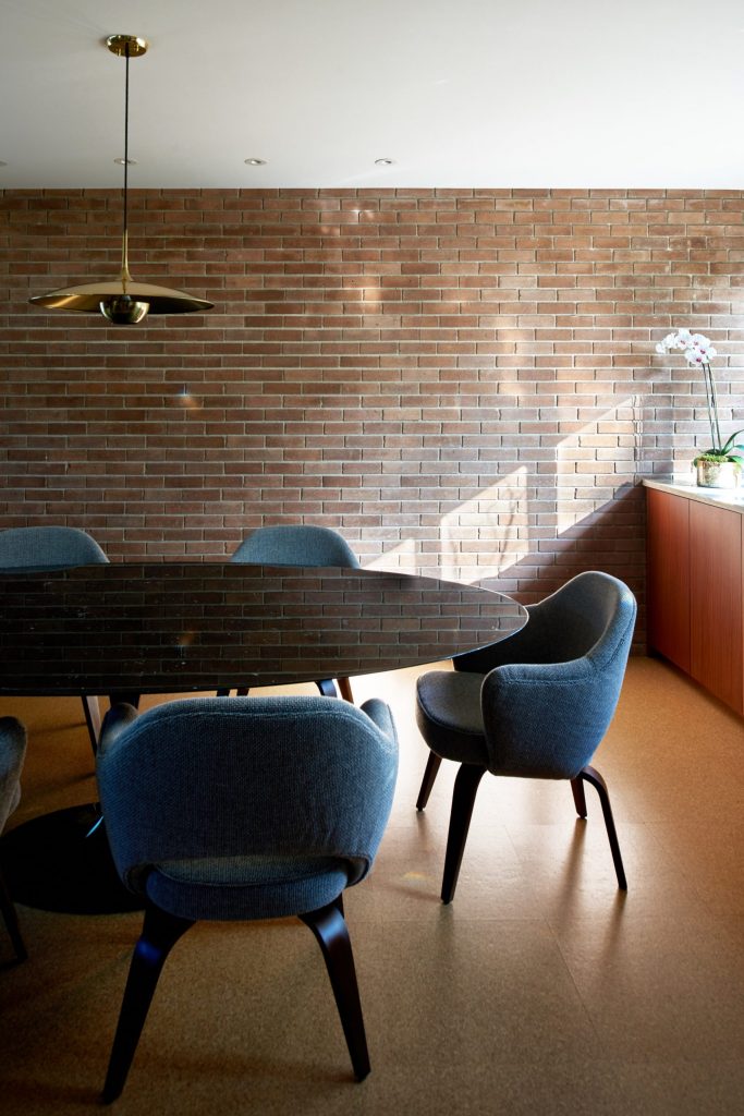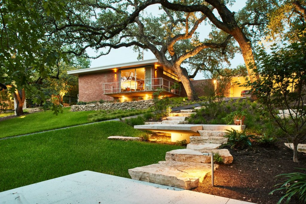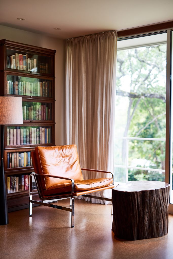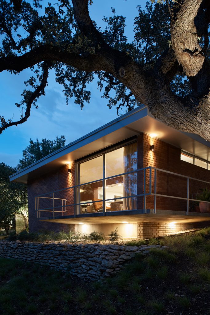 A 165 négyzetméteres, kétszobás, medencés ház egy domboldalon épült Austinban még az 1950-es években – új tulajdonosai pedig nagyon szerették volna, hogy a felújításkor minden régi karakter megmaradjon. Így a mahagóni-oszlopok és a téglafalak is maradtak, a dizájnban pedig érződik a modernista éra szerelme is. Meg persze olyan részletek is felbukkannak, mint az ikonikus Eames-fotel.