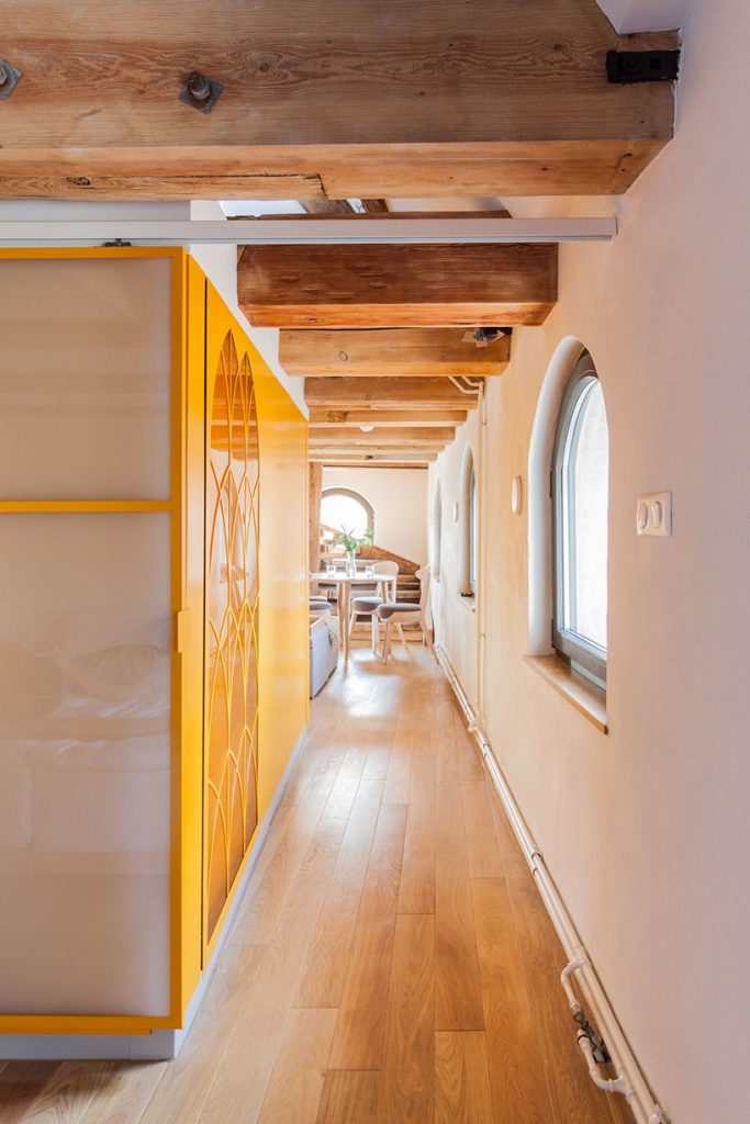 Znamy Się építész tervei alapján újult meg ez a gyönyörű, Toruńban található lakás – vagyis tulajdonképpen több lakást kapcsoltak össze (9 lakást 3 emeleten) ezzel a feltűnő, színes acél fürdőszobakockával egy épületben, amely előtte magtárként funkcionált. A tervezéskor figyelembe vették természetesen a történelmi karaktereket és tisztelettel bántak az örökséggel: megtartották és kibővítették az eredeti gerendázatot és az ablakok formáját is meghagyták. Szép lett.