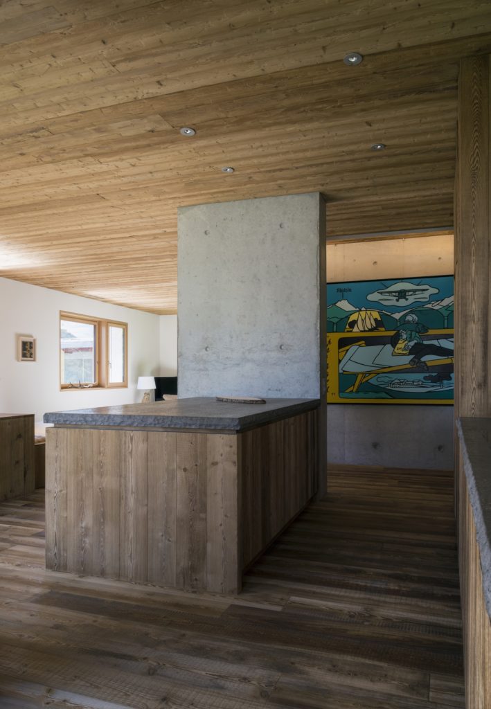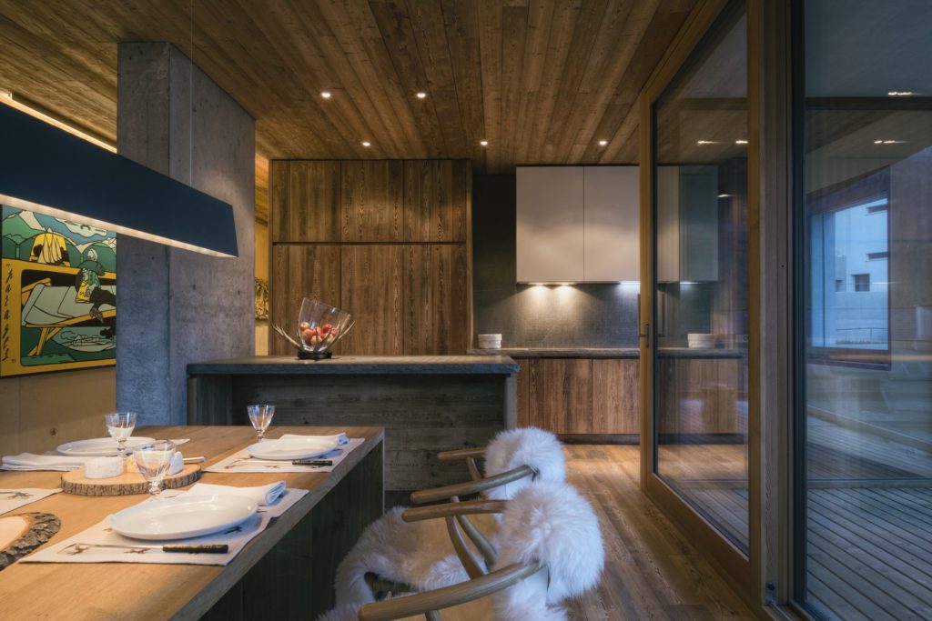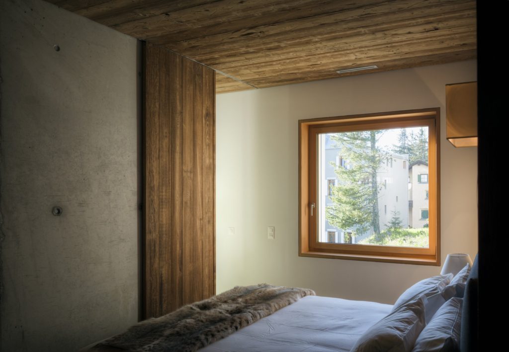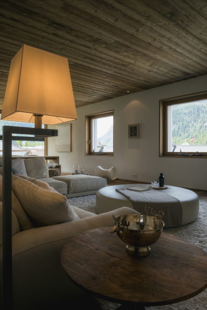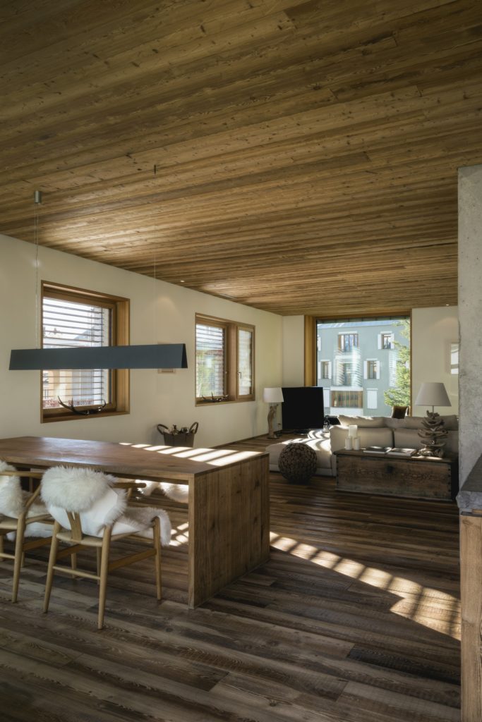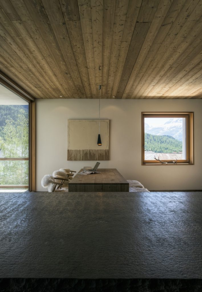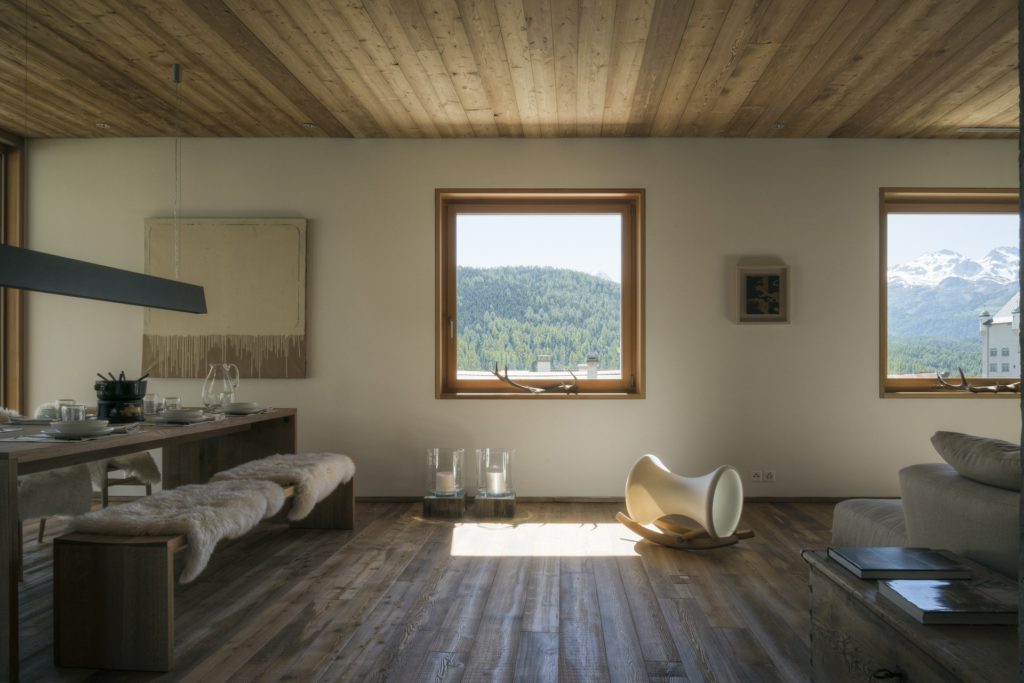 Pontesinában, gyönyörű hegyek közt fekszik ez a pompás, rusztikusan tiszta lakás. A hegyes-völgyes Berninára és az erdőkre tekintő, lélegzetelállító látványra pedig fantasztikus lehet minden reggel felkelni.