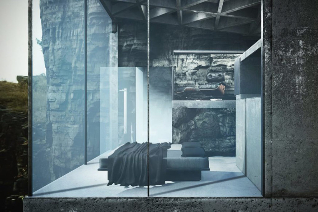 Az üvegkülső – nevezzük ablaknak, vagy inkább ne – szinte korlátlan szabadtéri kilátást biztosít. Közel a folyó, az erdő, sehol egy ember, sehol egy autó, sehol egy gép. A színek, valamint a házban domináló formák és anyagok – mint a betonpadló vagy a fekete matt berendezés – remek összhangban állnak a végtelen sziklatesttel. Ez a ház lényegében egyfajta architektúrai exklávé a természet testében, távol a civilizáció zajától, a valami és a semmi határvonalánál. Tökéletes hely az elvonulásra.