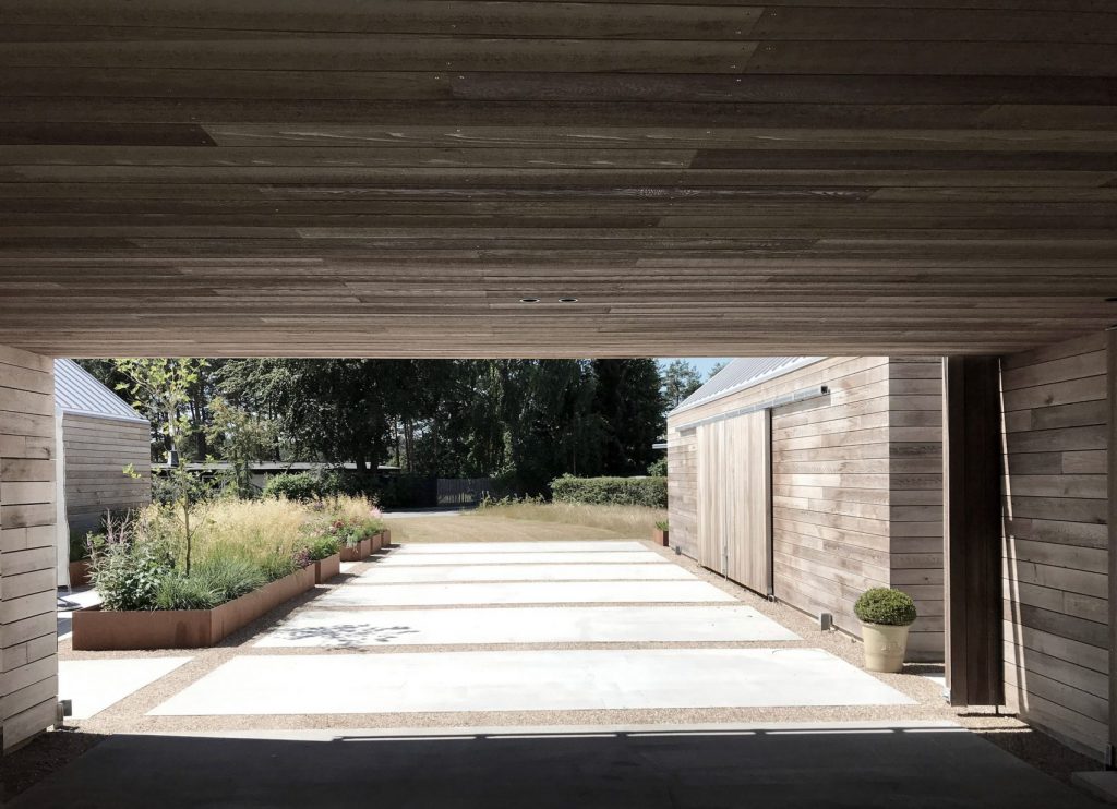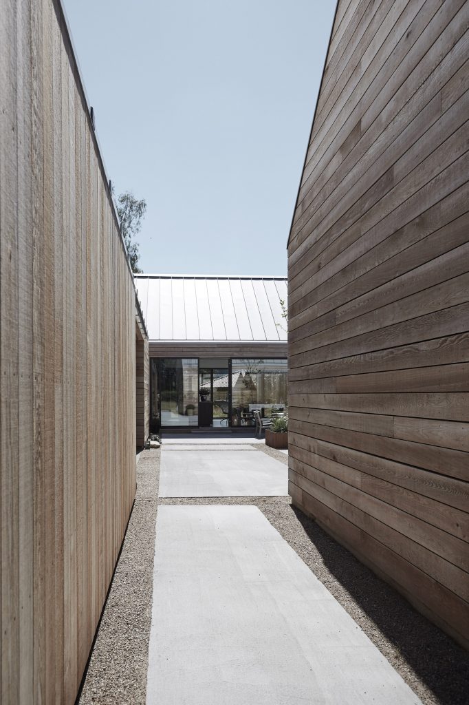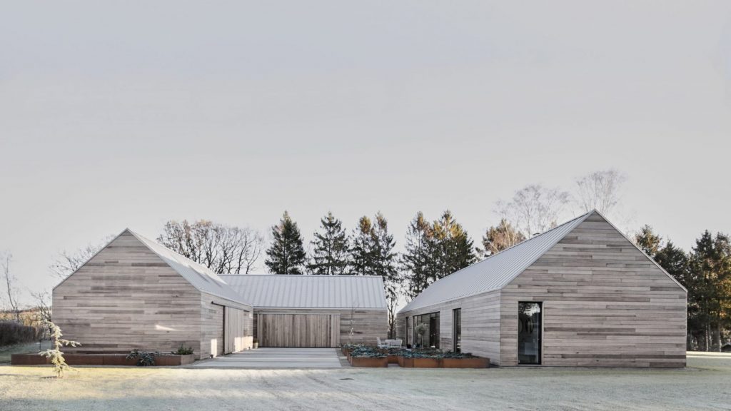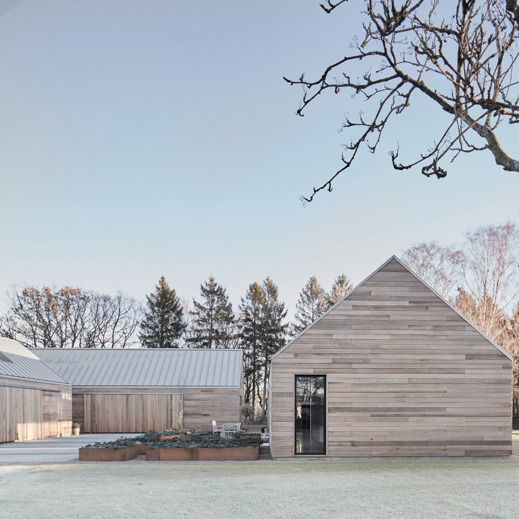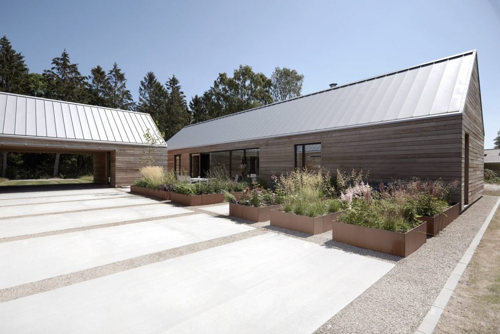 A dán házegyüttes eredetileg két pajtának készült, de végül újragondolták és három ház lett belőle. A vidéki környezetben épült, U alakú otthonban végül maradt egy pajtarész, ahol a tulajdonos sólymokat tart, a további két részben pedig otthoni iroda és a lakótér helyezkedik el. A világos cédrusborítás pedig gyönyörűen illik a környezetbe.