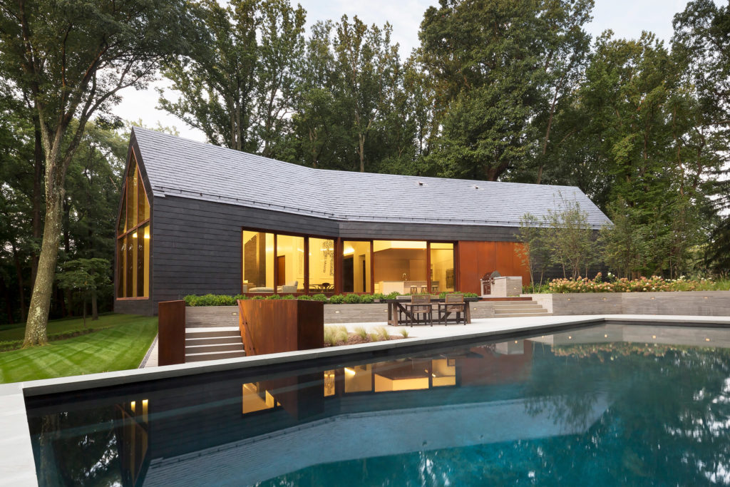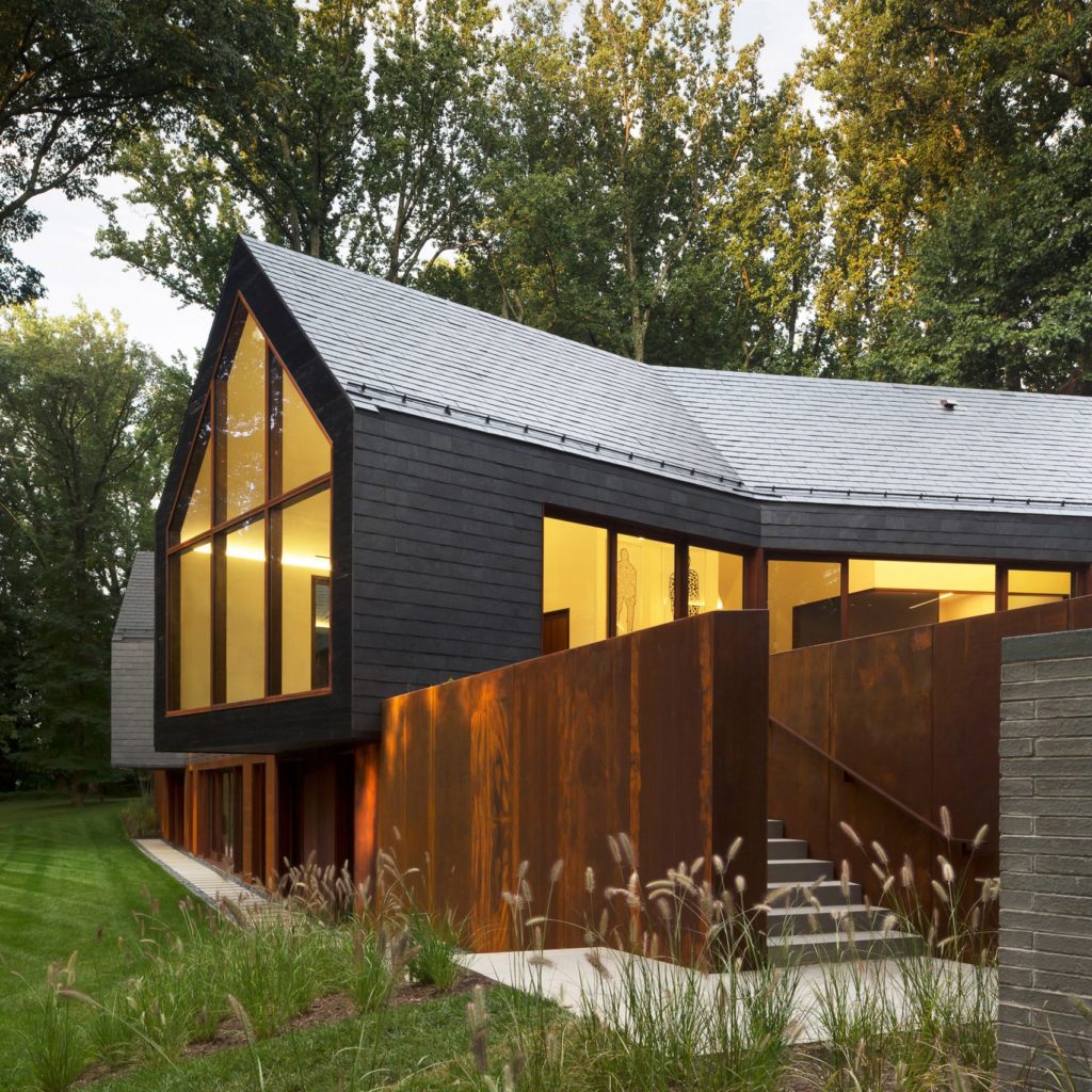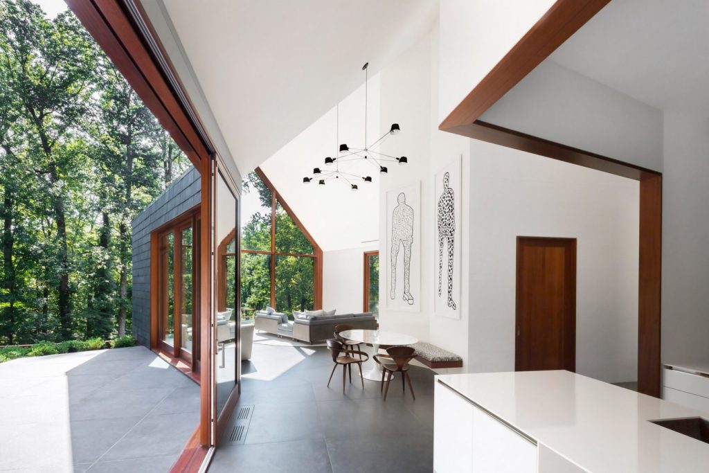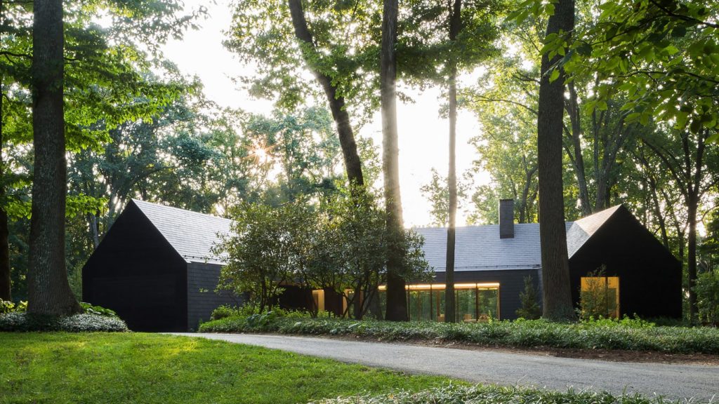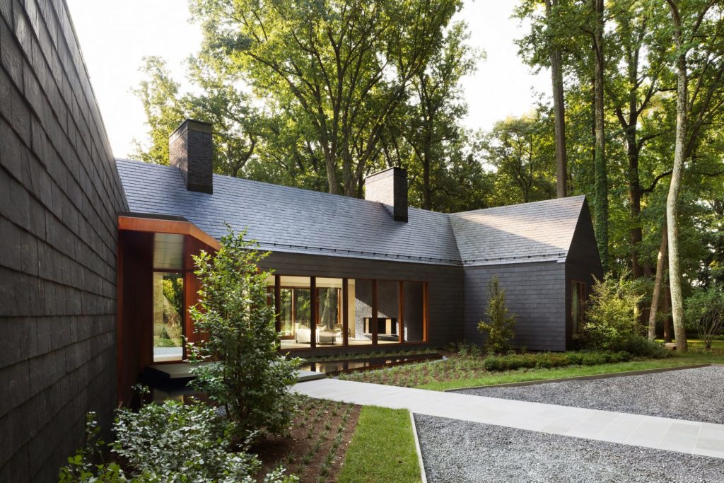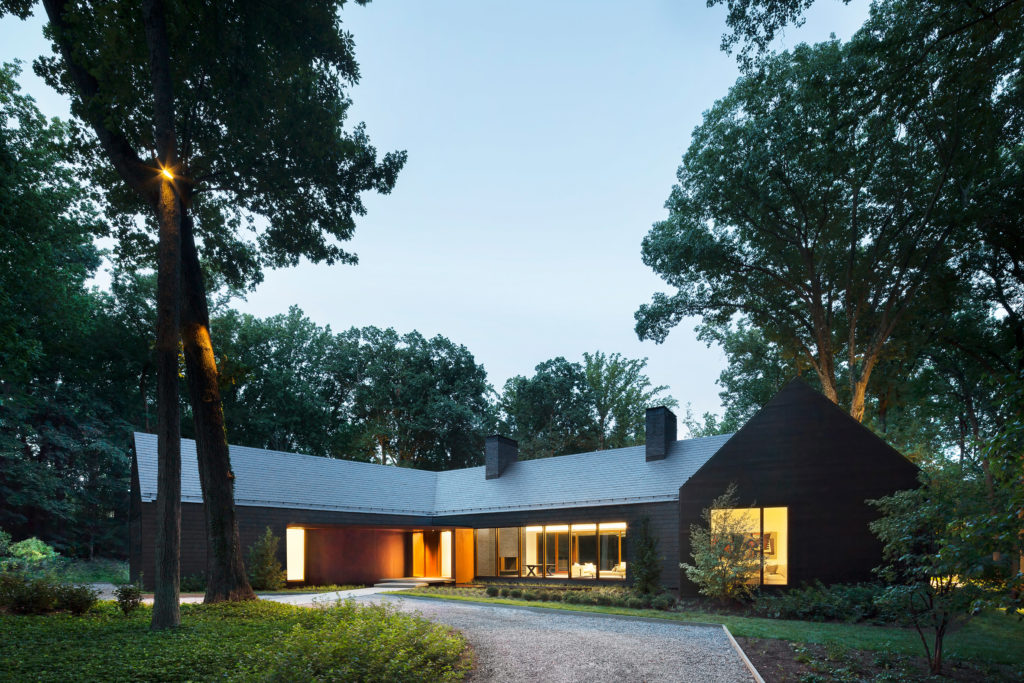 Egy elektromos hiba folytán ütött ki tűz ennek a marylandi háznak az elődjében 2013-ban; a ház annyira leégett, hogy tulajdonosai úgy döntöttek, inkább leküldik a romokat és teljesen új házat építtetnek. Az új otthon valami fantasztikus lett: már ránézni is relaxáló, a terek harmonikusak és szépen olvadnak össze a színek a ranch stílusú házat körülölelő erdővel.