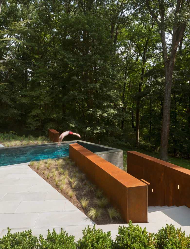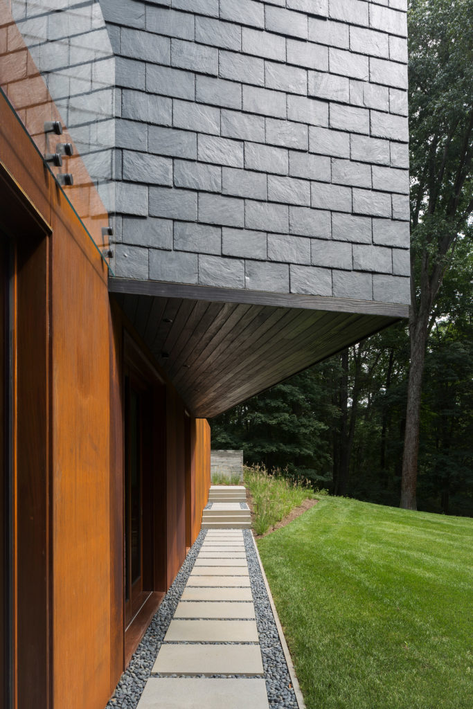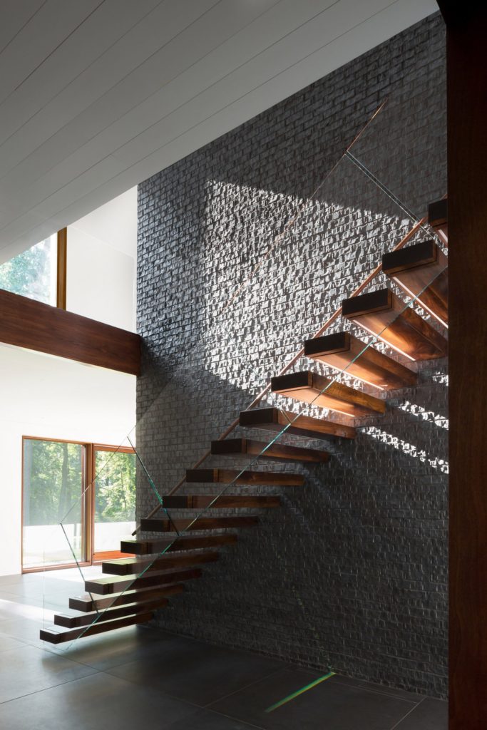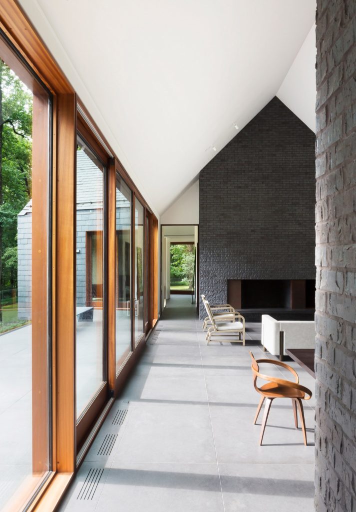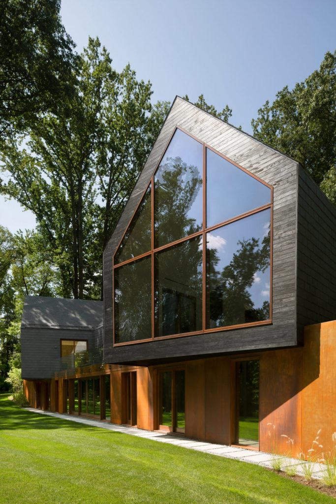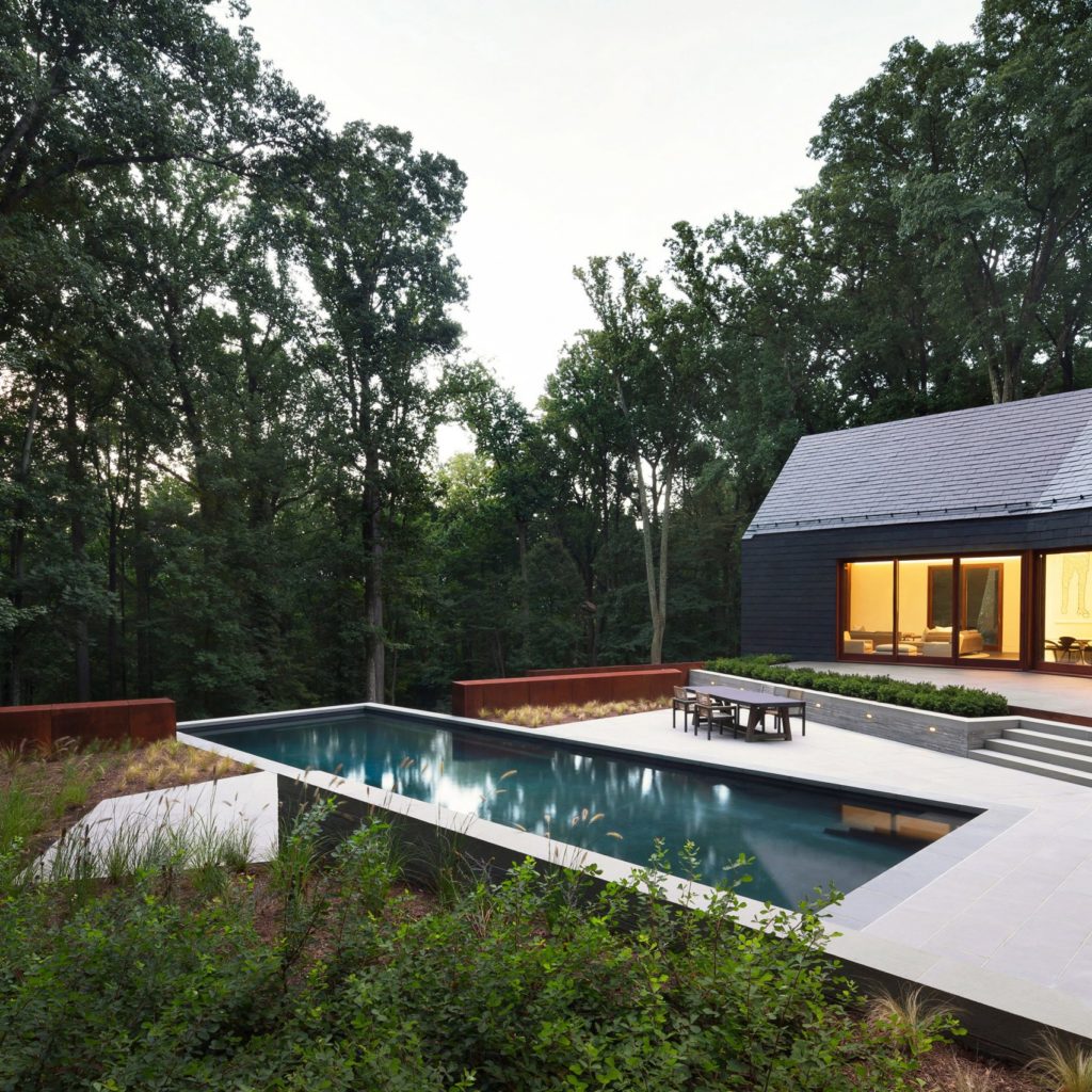 Egy elektromos hiba folytán ütött ki tűz ennek a marylandi háznak az elődjében 2013-ban; a ház annyira leégett, hogy tulajdonosai úgy döntöttek, inkább leküldik a romokat és teljesen új házat építtetnek. Az új otthon valami fantasztikus lett: már ránézni is relaxáló, a terek harmonikusak és szépen olvadnak össze a színek a ranch stílusú házat körülölelő erdővel.