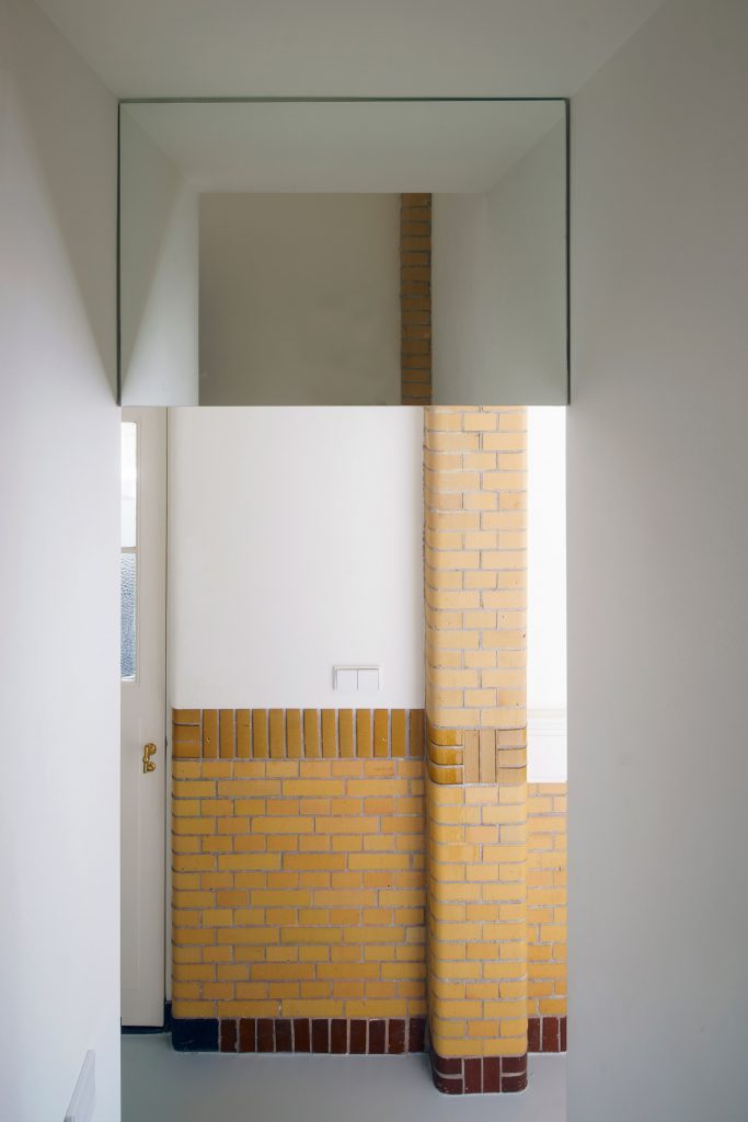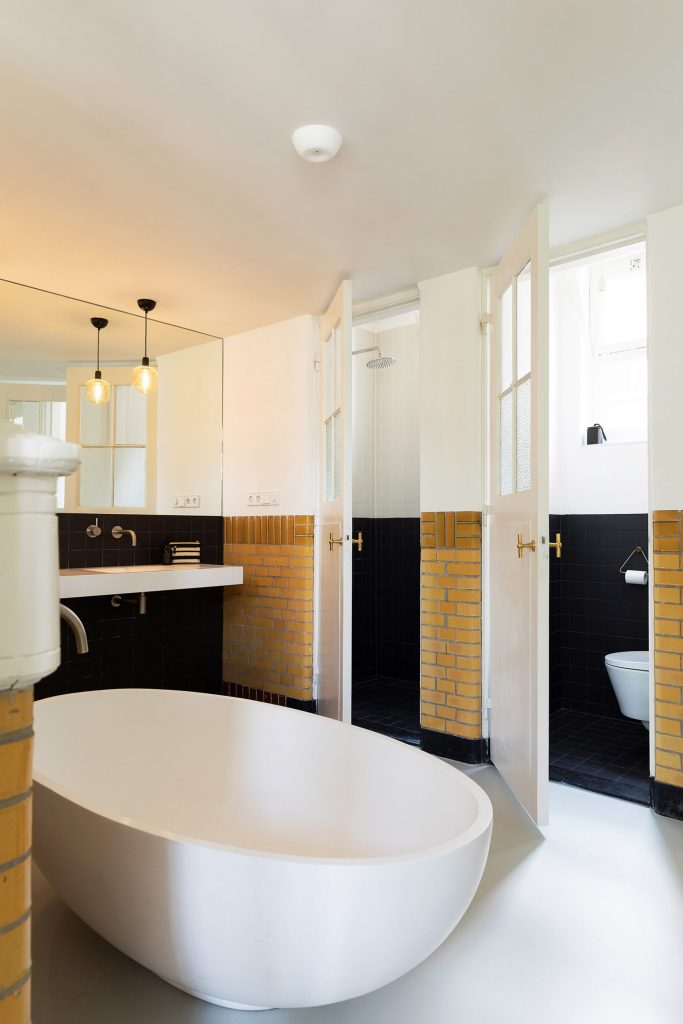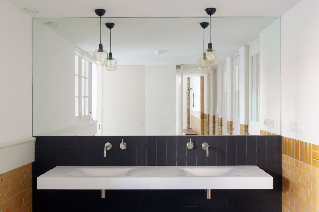 Az eredeti elemek közül látványosan suliszerű a mustársárga csempe a folyosón és az ablakok elrendezése is – a vécéfülkéket is megtartották, persze felújítva és különböző funkciókat adva nekik (például az egyik már nem vécé, hanem zuhanyzó). Ugyanitt, a fekete antracit fölött egy óriási tükörből pedig be lehet látni az egész folyosórészt.