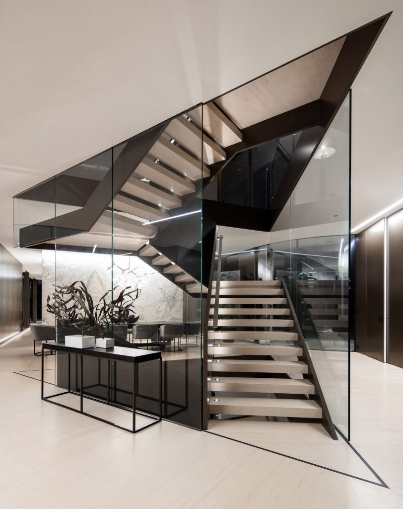 Az egyik szárny ad otthont a bejáratnak és a nappalinak, a másik szárnyban egy tíz fő számára kialakított étkező, tágas konyha és kamra, a harmadikban pedig a hálóhelyiségek (négy) és fürdők (szintén négy) kaptak helyet a felső szinten, de ez az északnyugati szárny szállásolja el a kocsikat is az öt autó számára kialakított garázsban. Az épület geometriai közepén elhelyezett lépcső stílusosan és praktikusan kapcsolja össze az amúgy távol lévő helyiségeket.