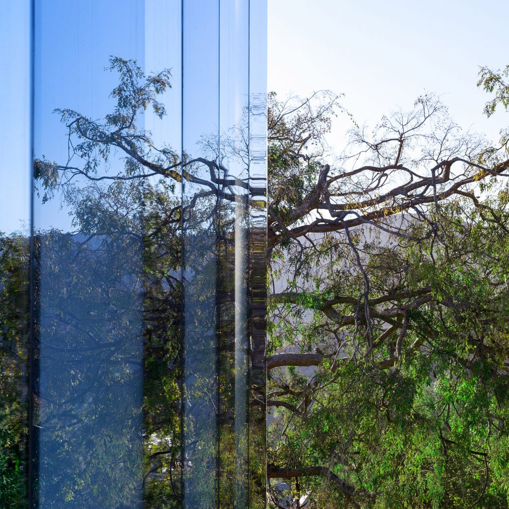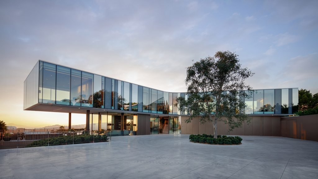 Az 1764 négyzetméteres, három szögletes szárnnyal kialakított rezidencia Los Angelesre tekint a Santa Monica-i hegyekből. Az ablakokat ötféle üvegből alakították ki, melyekben négyféle opacitás keveredik: visszatükröző, nem áttetsző, félig áttetsző és tisztán áttetsző üvegekkel játszanak az építészek, melytől változatosak és ragyogóak a külső felületek.
