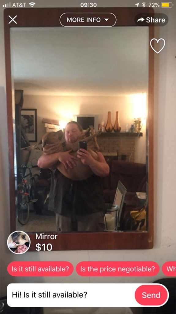 Nem mindenki végzett fotóssulit, aki eladni kényszerül egy-egy bútorát és kell lőnie róla pár képet. A műfajban kérdés nélkül aranyérmesek az eladásra szánt tükrökről készült fotók, amibe itt-ott tutira belóg valamilyen nem túl odatartozó részlet; mindezt pedig egy könnyfakasztó sorozatban gyűjtött össze az internet népe. Ez a mi negyven kedvenc elfuseráltan nagyon vicces példányunk.
