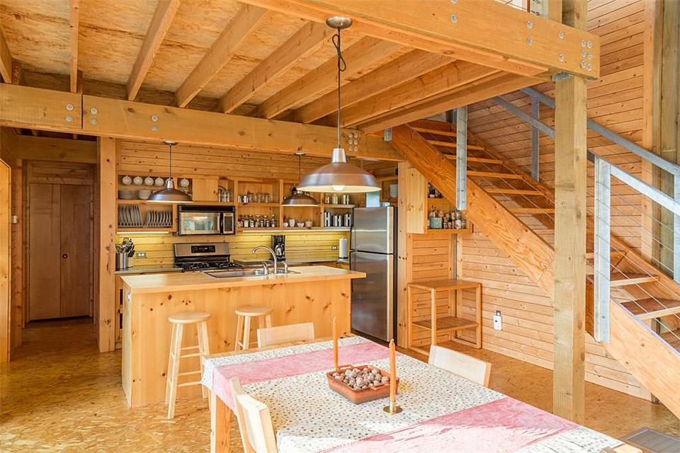 Nemcsak kint, hanem bent is a fa dominanciáját látni, lényegében a mennyezet, a székek, az asztal, a lépcső, meg úgy szinte minden fából van összerakva. De egy kanyonban felhúzott épületnél ez valahol természetes is. A ház részét képezi még egy emeletes rész, egy műhely és egy borospince is. A 46 hektáros ingatlan lényegében egy darabka otthon a hatalmas vadonban. Akit folyamatosan hív az anyatermészet, az talán keresve se találhat magának jobb helyet.
