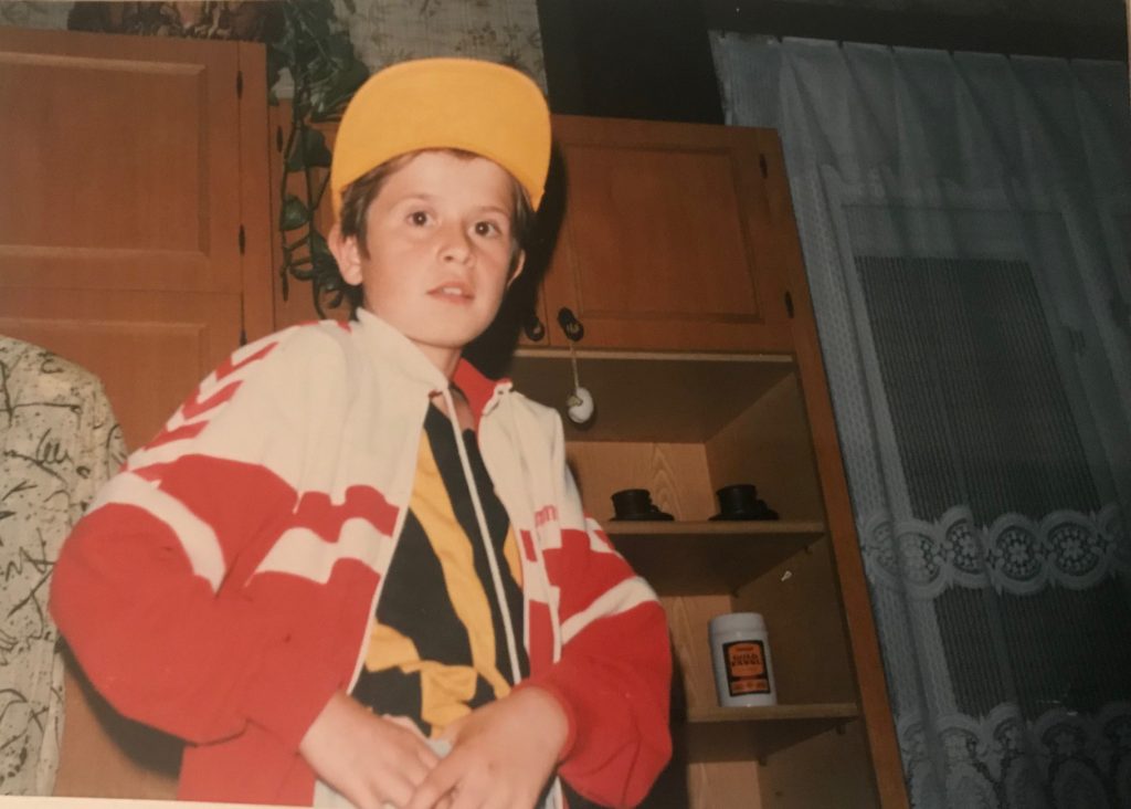És végül itt egy fotó e sorok szerzőjéről. A csodálatos, minden bizonnyal kamu Hummel melegítő mellett a fókusznak a háttérben lévő, hazai gyártású bútorra (továbbá a függönyre, tapétára, egyéb berendezési tárgyakra) kellene esnie.
