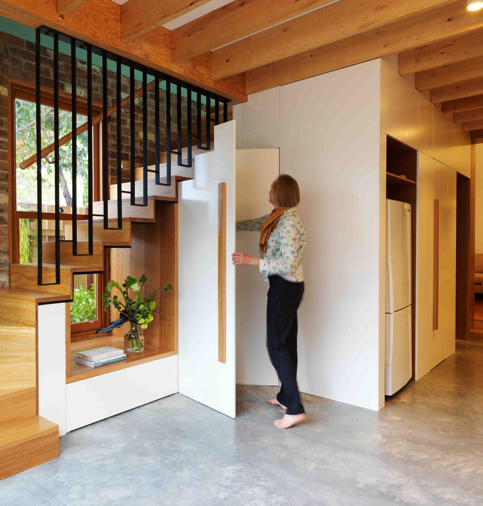 A kissé öncélú asszociációs cím után itt van némi konkrétum: egy stílusos alexandriai házról van szó, ahol nagyon dizájnos kis kuckót alakítottak ki a lépcső alatt. A 112 négyzetméteres ausztrál épületben nem csak ez az egy ügyes és kreatív megoldás: a konyhát és úgy magának a háznak az alakját is nagyon bírjuk.