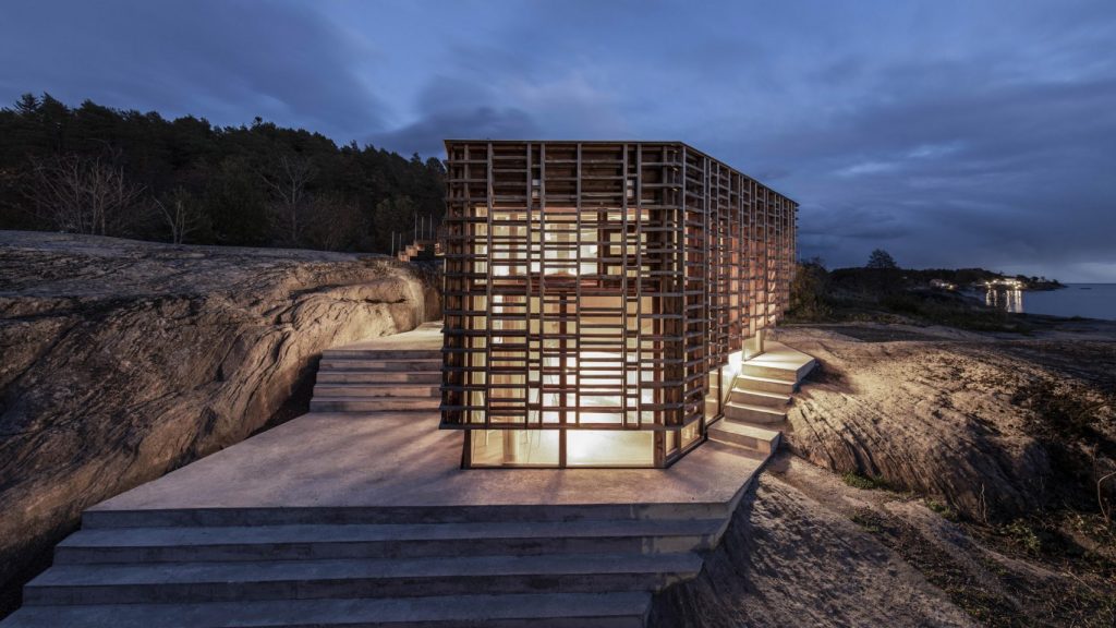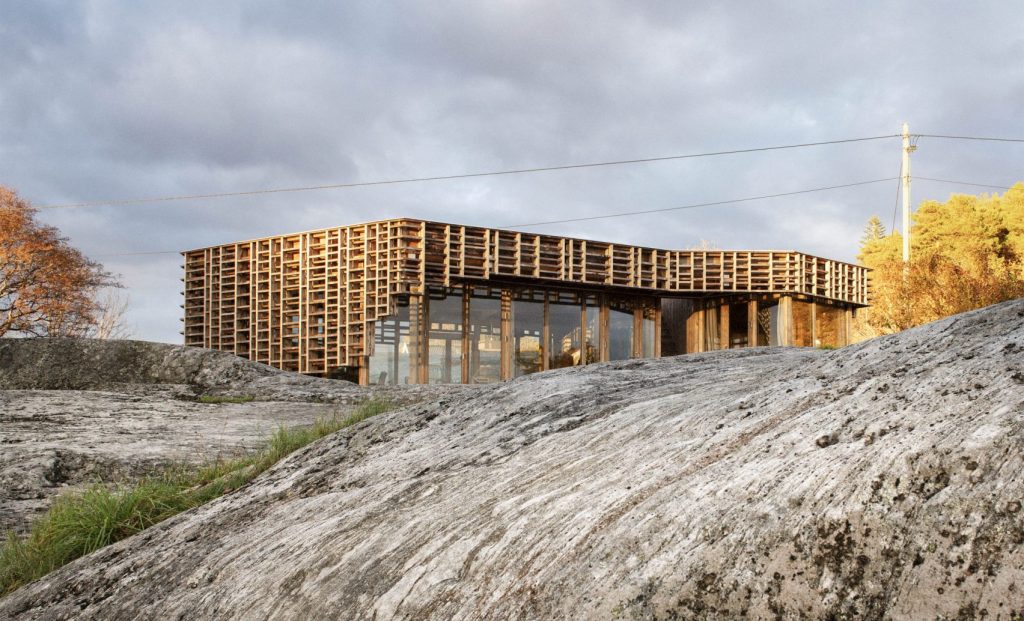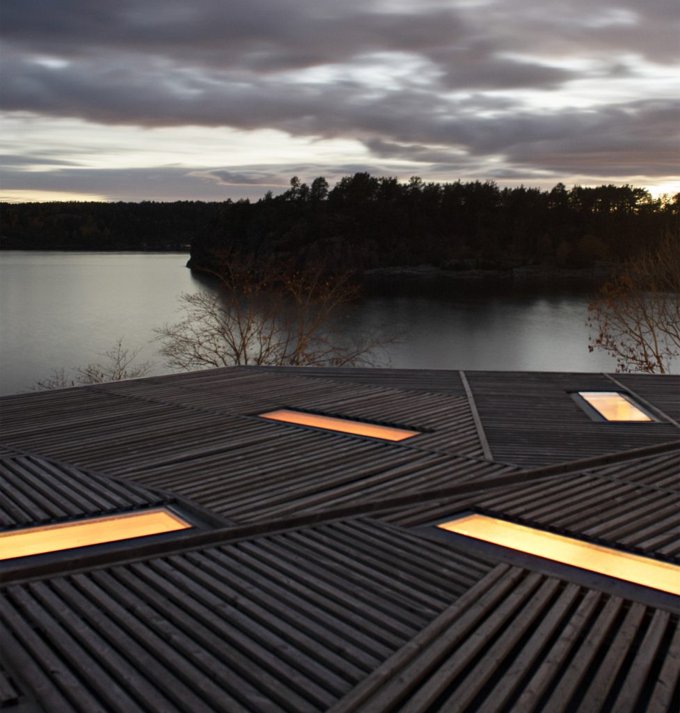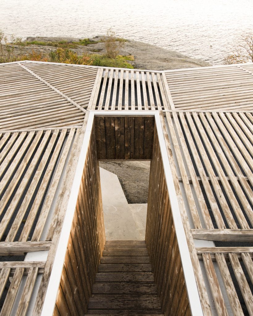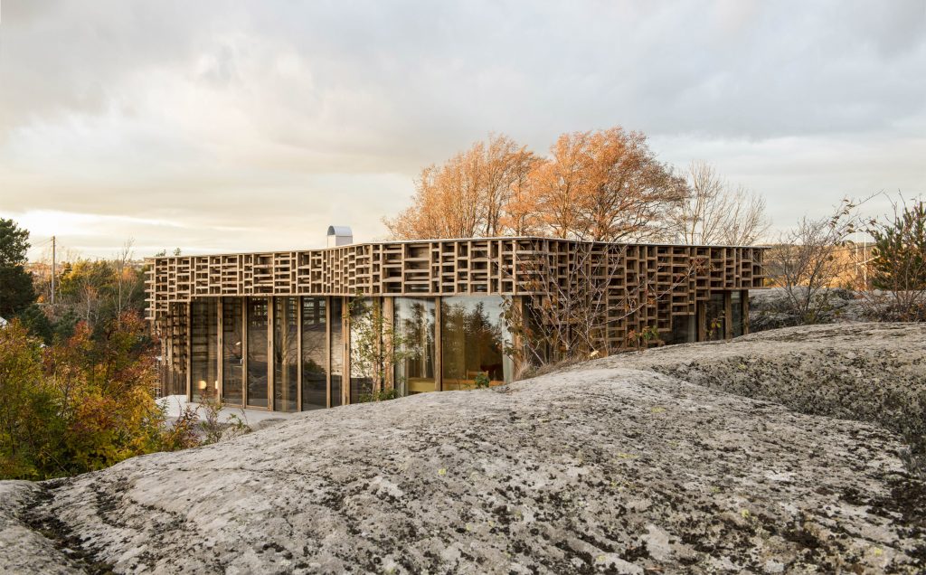 Skåtøyban, egy kis szigeten épült ez a ház egy művészpáros stúdiójának: időről időre hónapokra ide vonulnak gondolkozni, dolgozni, alkotni, feltöltekezni. Az üvegfalakat kívülről borító faszerkezet célja az volt, hogy úgy szűrje meg a természetes fényt, ahogy az ágak és falevelek engedik át a napsütést, a betonelemek pedig szintén nagyon vagányul egészítik ki a tereket. Szeretés.