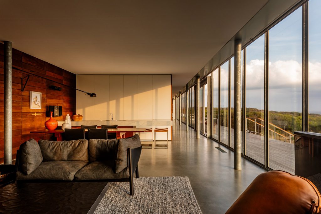 A lejtőre épített ház külseje fémből, fából, kőből és betonból lett felhúzva, körülötte pedig tehenek, végtelen víz, rétek és óceánpart. Belül pedig lágy színek, otthonosság és persze egy pazar medence. A kilátás pedig mindent visz.