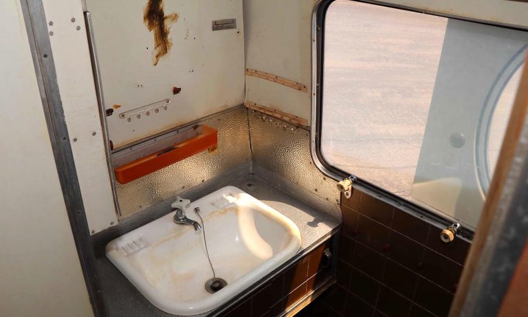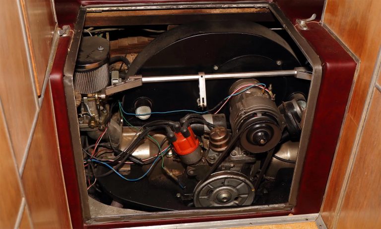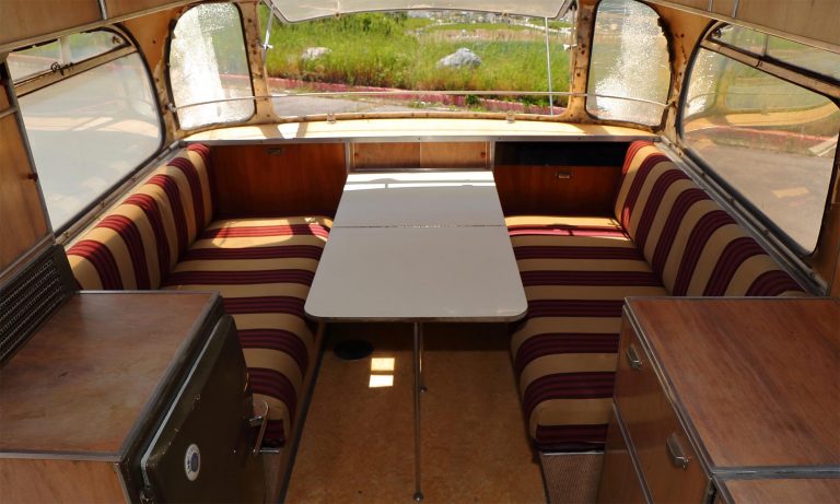 étkezőasztal, gáztűzhely, mosogató, hűtőszekrény és fürdőszoba is került bele. A motorja már nem eredeti, de négyhengeres bokszer ez is, és az állapota sem túl szívderítő, egy alapos felújítás ráférne, de aki fantáziát lát benne, a Mecum aukcióján csaphat le rá augusztus közepén.