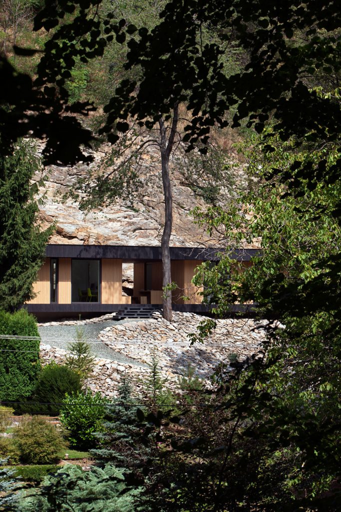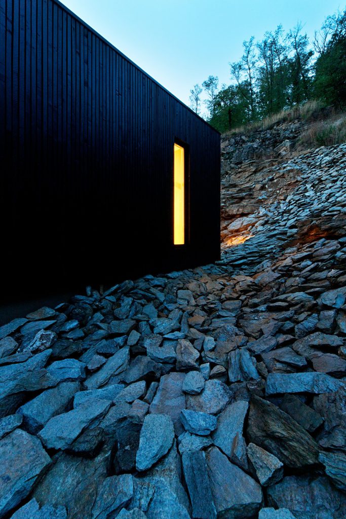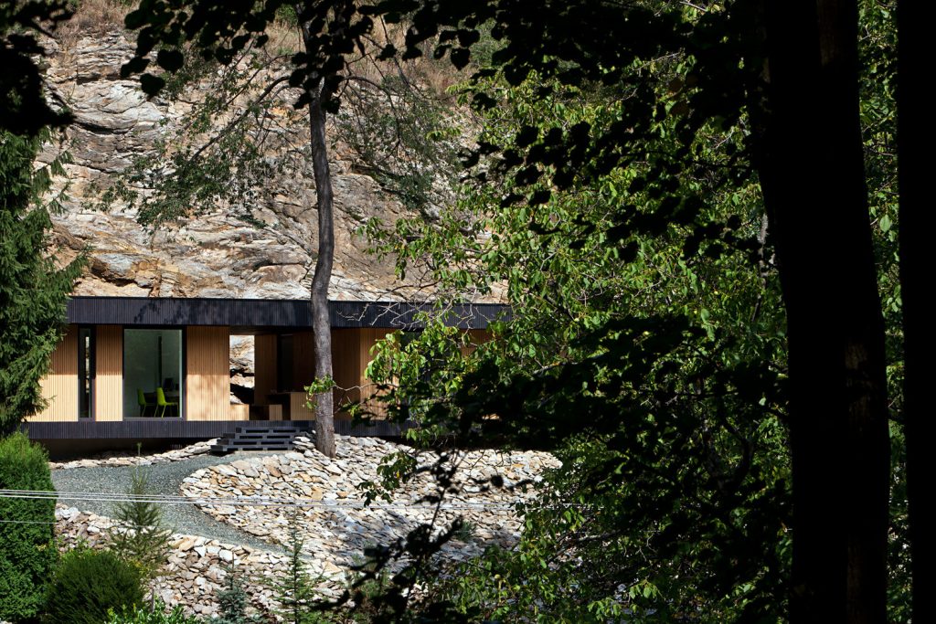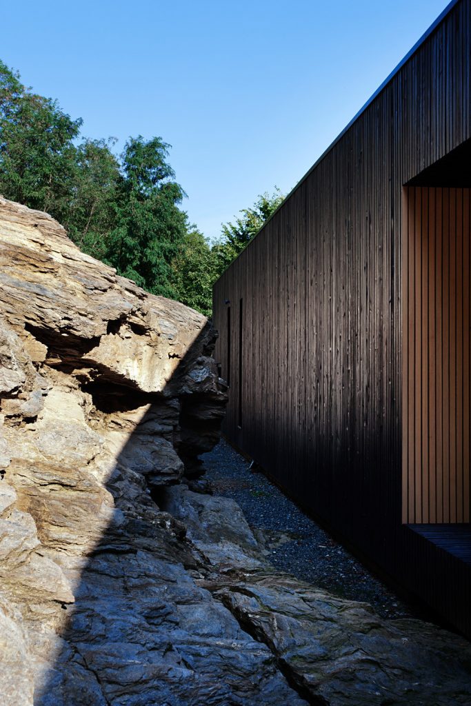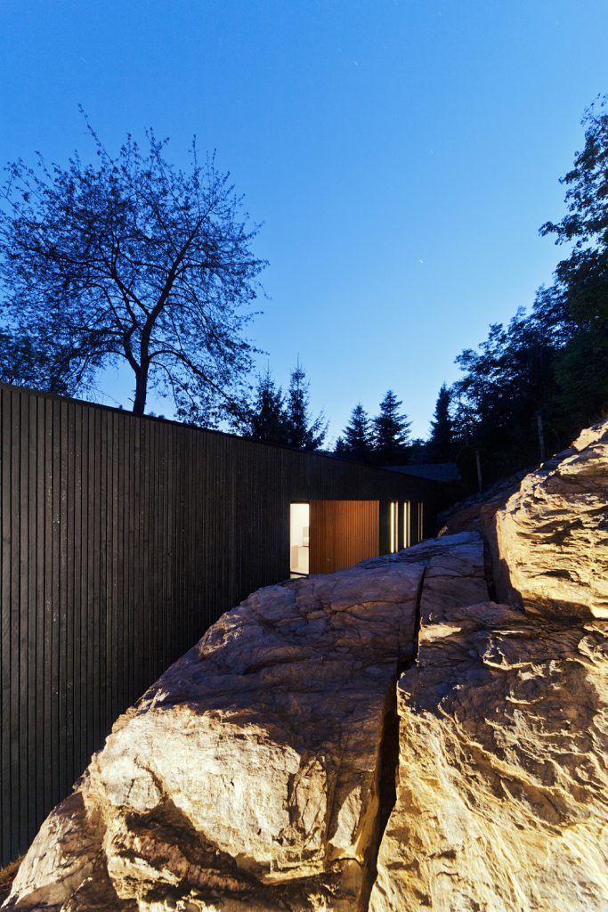 Évszázadokig kőlelőhelyként használták ezt a sziklás részt Kőszegen; a szoborszerű sziklafal gyönyörű hátteret biztosít a völgy fölé épített, sőtét fával burkolt háznak – ami belül mellesleg meglepően világos. Az első képeket nézve amúgy totál azt hittük, valamilyen texasi otthonra kattintottunk és kifejezetten megörültünk, hogy ez egy hazai családi ház. Szerintünk példaértékűen szép.