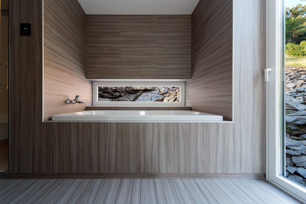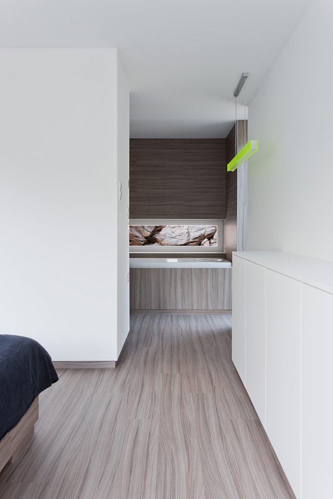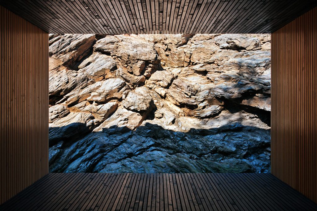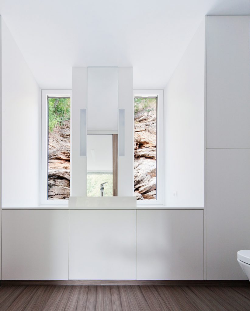 Évszázadokig kőlelőhelyként használták ezt a sziklás részt Kőszegen; a szoborszerű sziklafal gyönyörű hátteret biztosít a völgy fölé épített, sőtét fával burkolt háznak – ami belül mellesleg meglepően világos. Az első képeket nézve amúgy totál azt hittük, valamilyen texasi otthonra kattintottunk és kifejezetten megörültünk, hogy ez egy hazai családi ház. Szerintünk példaértékűen szép.