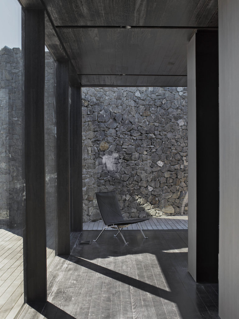 Egyébként a várfalakra emlékeztető megoldás és a hatalmas, egybefolyó ablakoszlopok is tökéletesen passzolnak ahhoz a fagyos hangulatból, amit a ház áraszt magából. A kőfalak egyébként remek védelmet nyújtanak az erős tengerparti szelek ellen, de a rideg, sötét enteriőrre ez sem ad magyarázatot.