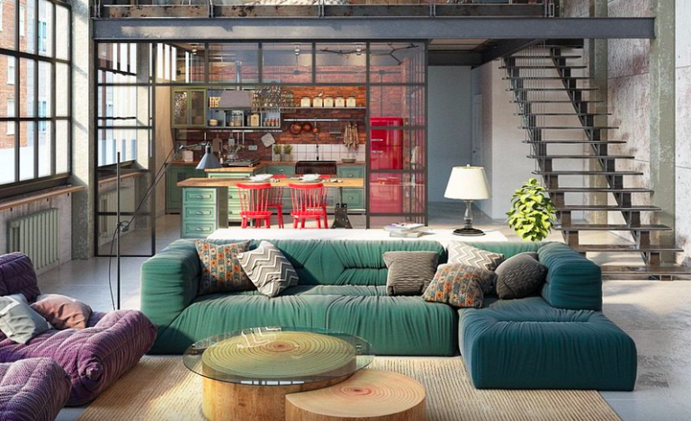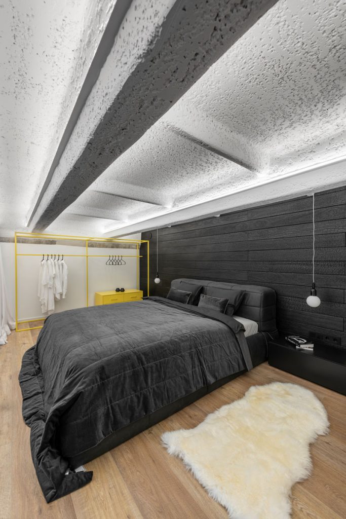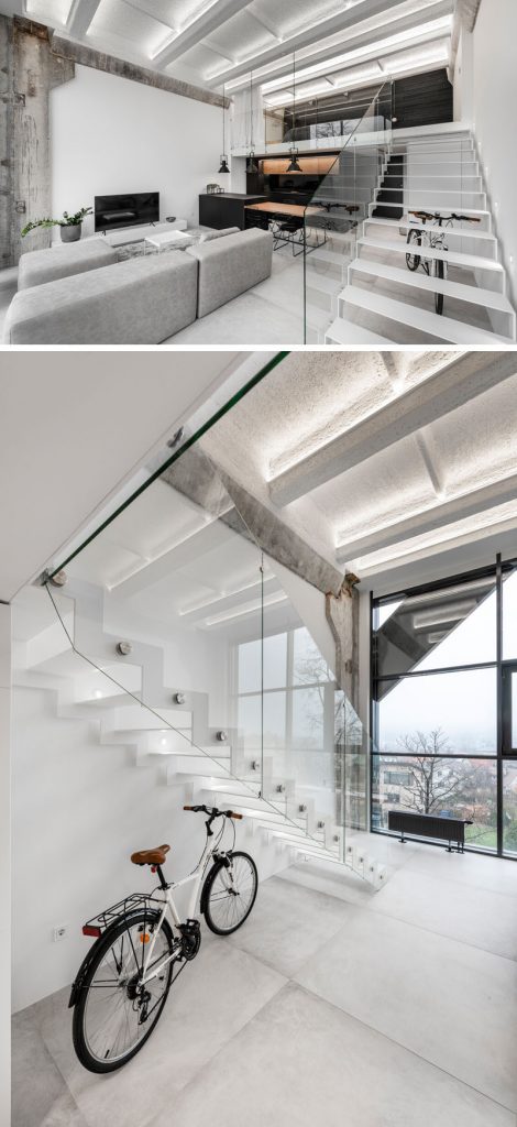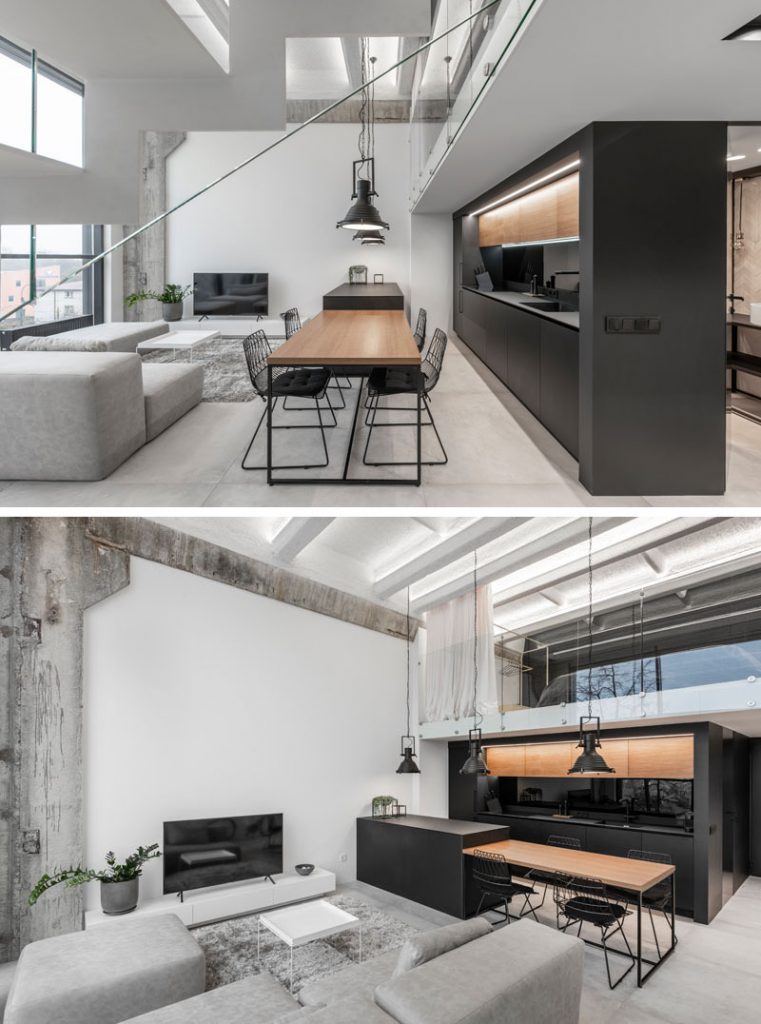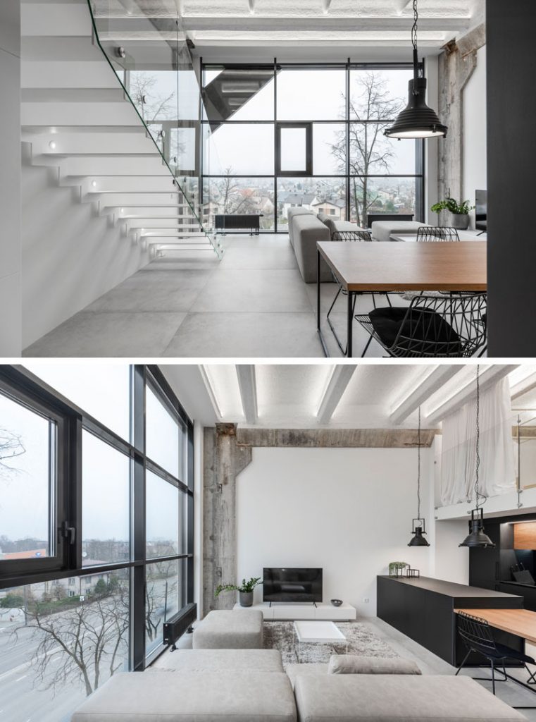 A 64 négyzetméteres apartman egy többlakásos ipari épületben található, amelyben a nyersbeton-felületek és a hatalmas ablakok a frissen meszelt fehér falakkal és modern bútorokkal vannak kombinálva. A konyhát és a nappalit egy apró sziget választja el egymástól, az új térrész pedig ideális étkezőhelyet biztosít négy ember számára.