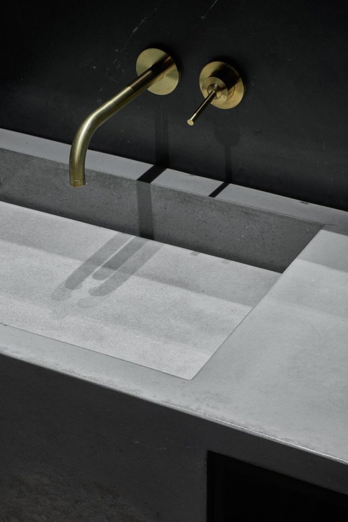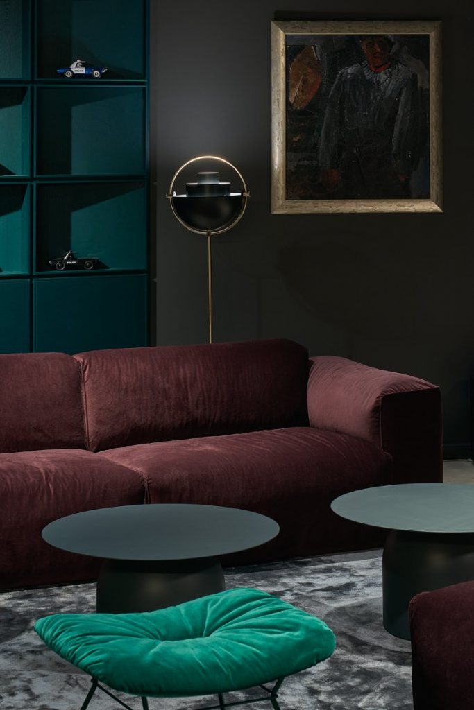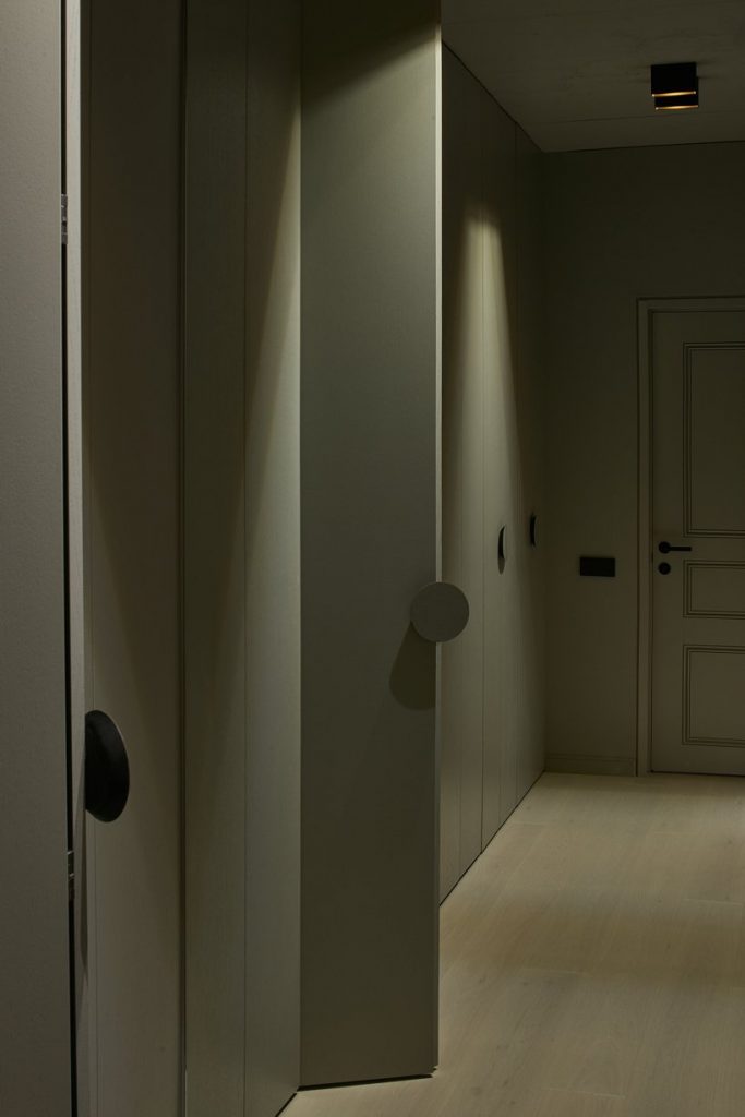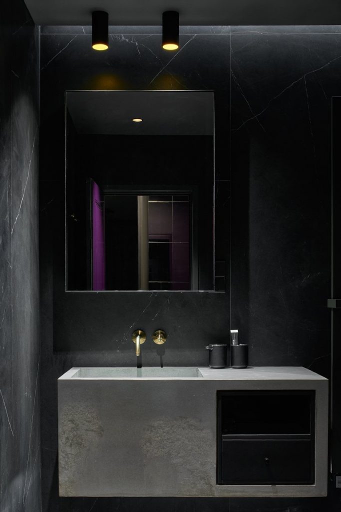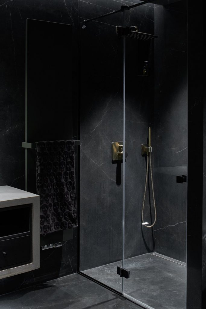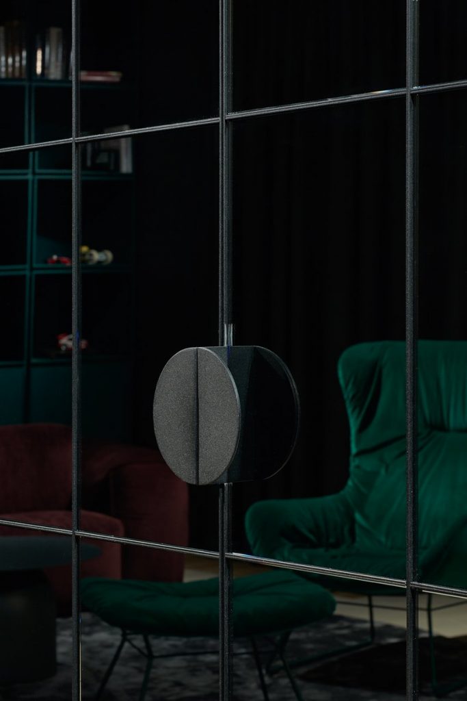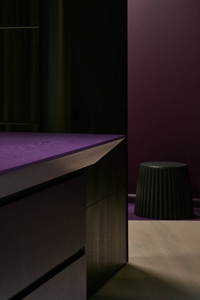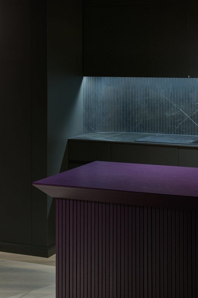 A 80 négyzetméteres, noir litván lakásban nagyon drámai színek uralkodnak: mélyzöldek, királyi lilák, erős szürkék és alvadtvér-bordók, miközben a fém- és márványrészletek az eleganciát erősítik. A sötét és világos játéka a helyiségek között, valamint a nagyon éles kontrasztok pedig teljesen azt az érzetet keltik, mintha egy színpadot néznénk.