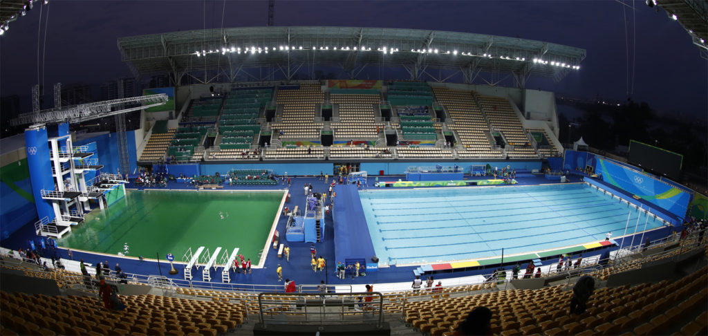 Annak sem kicsi, mivel a műugrómedence mellett ott a vízilabdásoké is, az pedig maradt a hagyományos kék, így pedig nagy a kontraszt. Nem biztos, hogy leugranánk a toronyból, de ha mégis, akkor inkább nem egy gyanúsan zöld, nem teljesen átlátszó mesterséges víztömegbe.
