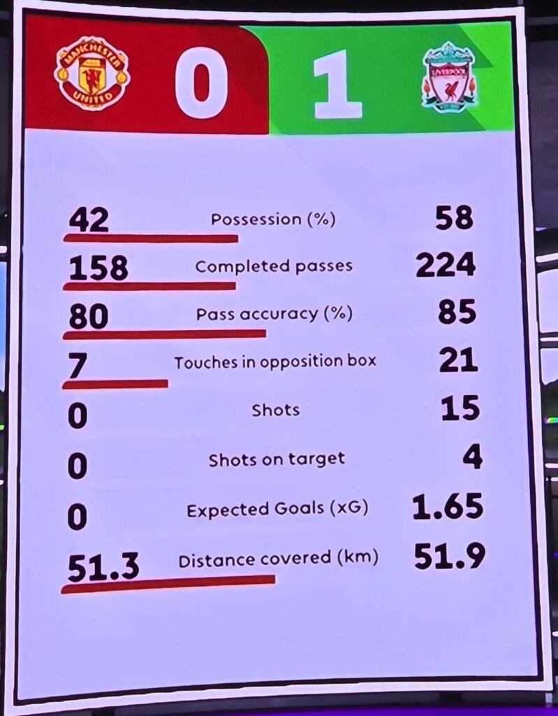 De majdnem mindent kihagyott a Liverpool, Szoboszlainak is voltak helyzetei, végül Díaz betalált, így előnnyel mentek szünetre. A fenti statisztika után kevesen gondolták, hogy a második félidőben fordít az MU.