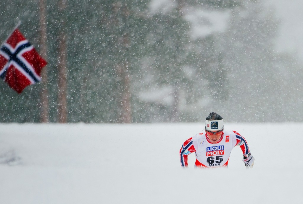 Szintén sífutás, a vébé, Svédországban, a kép hasonlóan zseniális, mint fent. Marit Björgen érkezik a havazásban, a domb mögül.