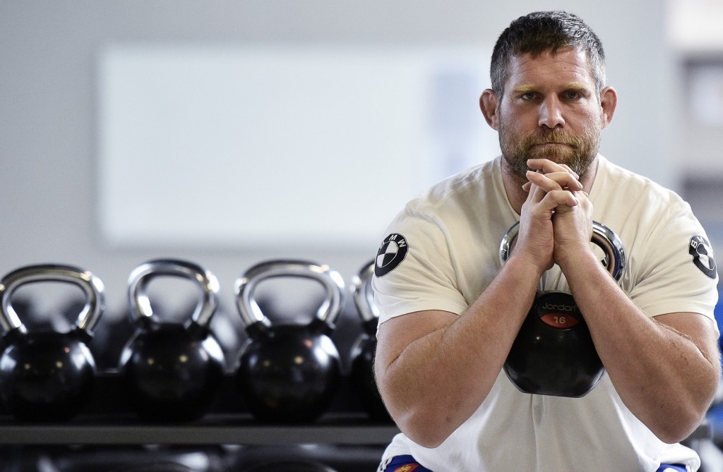 A francia rögbis, Vincent Debaty emelgeti a kettlebellt.