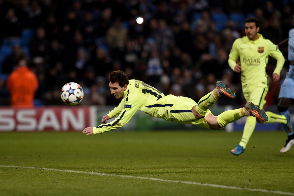 Messi úszik a levegőben, a kihagyott tizenegyese után fejel... mellé. De a Barca így is nyert Manchesterben.