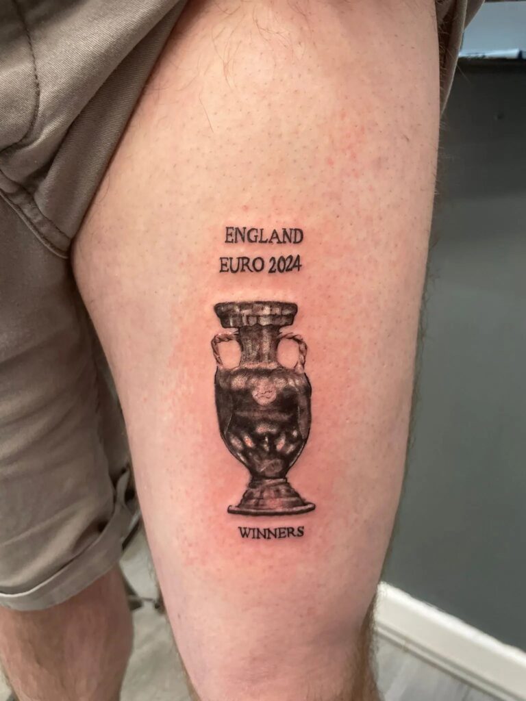 Egy 29 éves angol drukker, Dan Thomas is így tett, a döntő előtt magára tetováltatta az Eb-trófeát, a dátumot és azt, hogy Anglia lesz a győztes.
