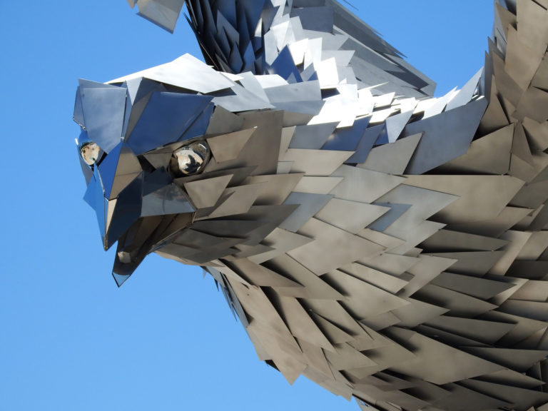 Ez a 12,5 méter magas, 20 méteres szárnyfesztávolságú és 36,5 tonnás szobor akár megfelelhetne az amerikai Fradi-sas szobornak, merthogy igencsak hasonlít rá, persze ez nem meglepő, hiszen ezt is Szőke Gábor Miklós tervezte, aki az FTC madarát – na, nem a fergetegesen pazar kabalát –, mondjuk ez egy kicsit annál nagyobbra sikeredett.