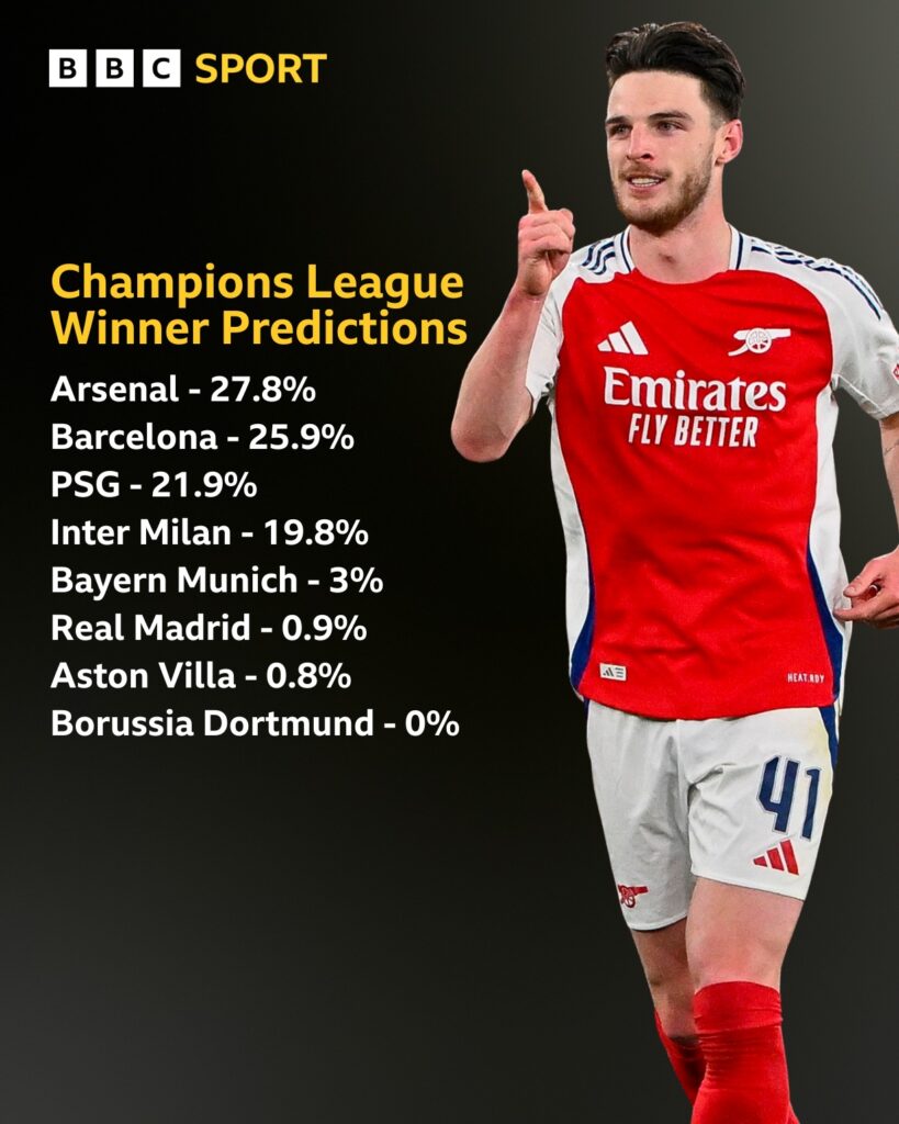Az Arsenal végső sikerére 27,8 százalék esély van, a Barcelonáéra 25,9, a PSG pedig 21,9-en áll.