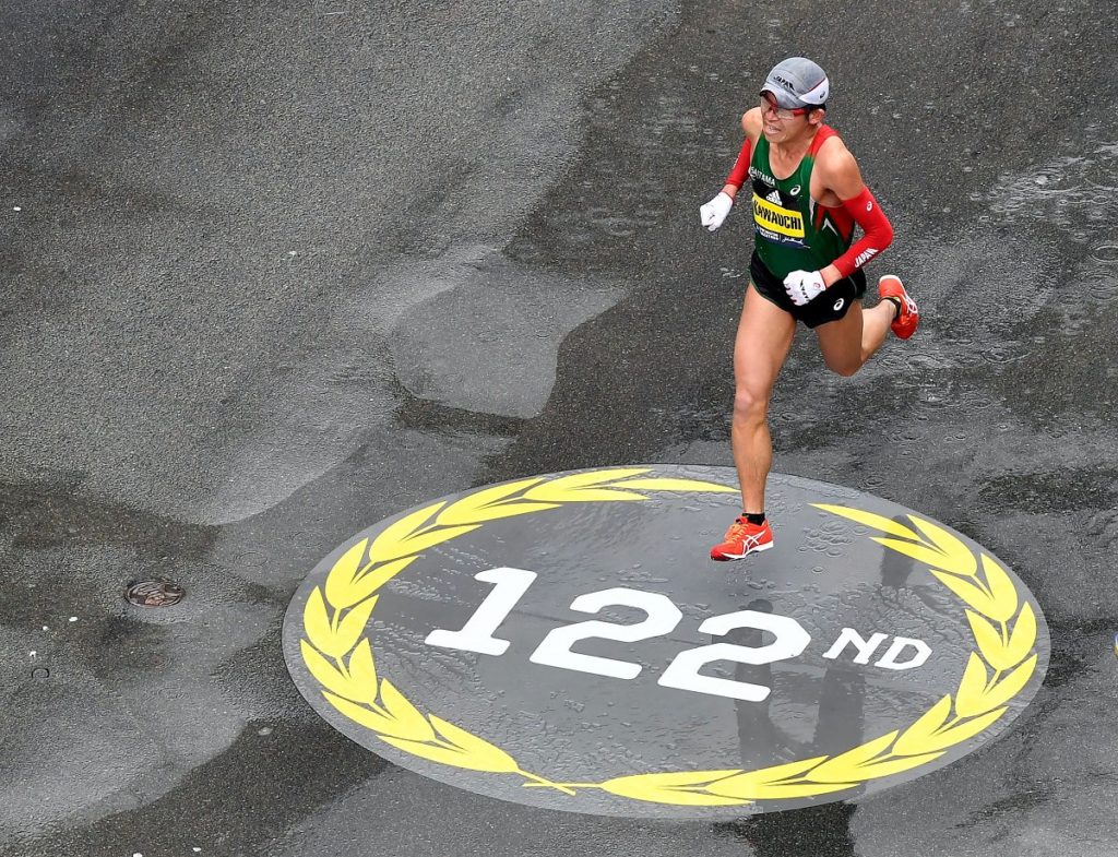 A japán sportoló nagyon erős, 15 perces első öt kilométerrel nyitott, hogy leszakítson egy élbolyt, mert nem akart sűrű mezőnyben futni. Később a címvédő kenyai Geoffrey Kirui meglépett, másfél perces előnyt dolgozott ki, úgy tűnt, eldőlt a verseny.