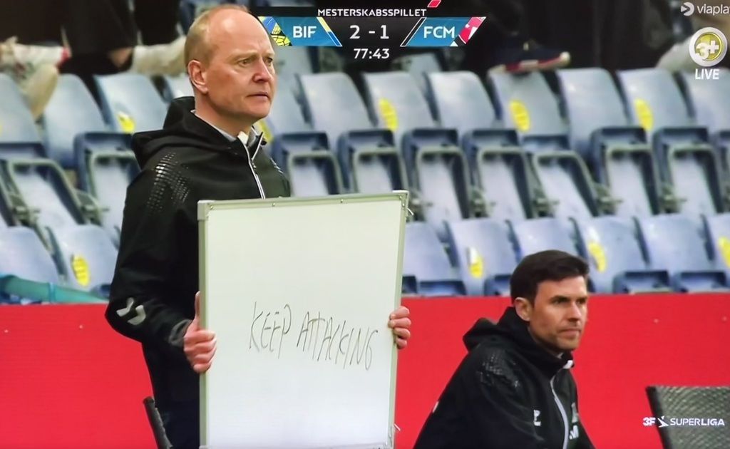 A dán bajnokságban második Brøndby a listavezető Midtjyllanddal játszott. A Brøndby edzője, Niels Frederiksen egyedi megoldást választott, ahelyett hogy folyamatosan bekiabálta volna a játékosainak, hogy hajtsanak, inkább egy táblára felírta: Támadjatok tovább! A táblát pedig felmutatta a futballistáinak.
