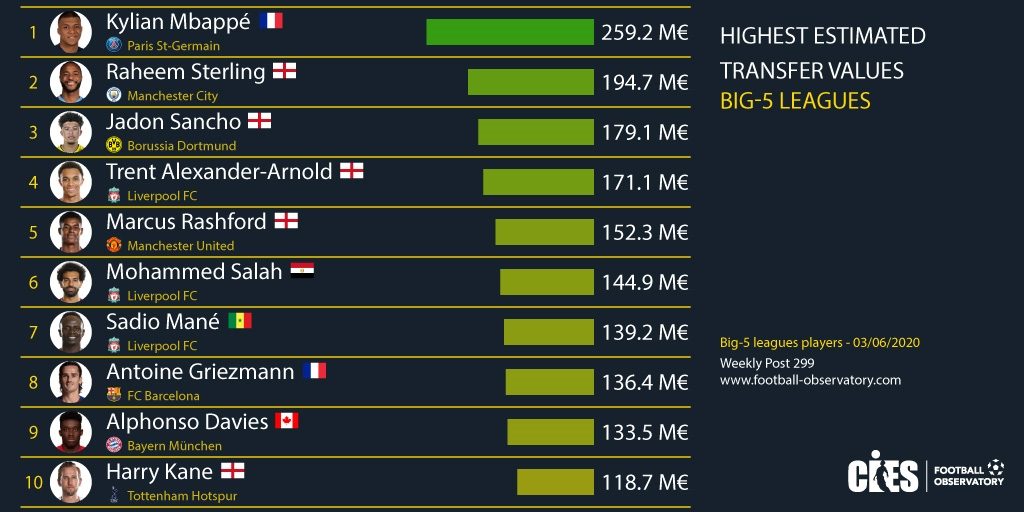 A CIES egy algoritmus alapján időnként rangsorolja a futballistákat az értékékünk alapján. A listán már egy ideje Kylian Mbappé az első, a francia világbajnok 259,2 millió eurót ér a CIES szerint. A lista második helyén a City szélsője, Raheem Sterling (194,7 millió euró) található, míg a harmadik szintén egy angol szélső, a Dortmund futballistája, Jadon Sancho (179,1 millió euró).