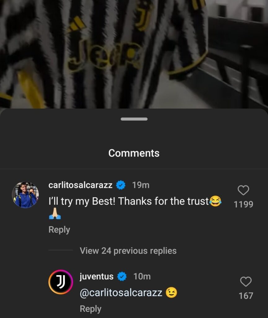 Ebben semmi különös nincs, az már viszont viccesebb, hogy a komment a teniszező Carlos Alcaraztól jött. A korábbi világelső, Grand Slam-bajnok spanyol lecsapta a magas labdát, és amikor látta, hogy névrokonát leigazolta a Juve, akkor erre egy kis csibészséggel reagált.