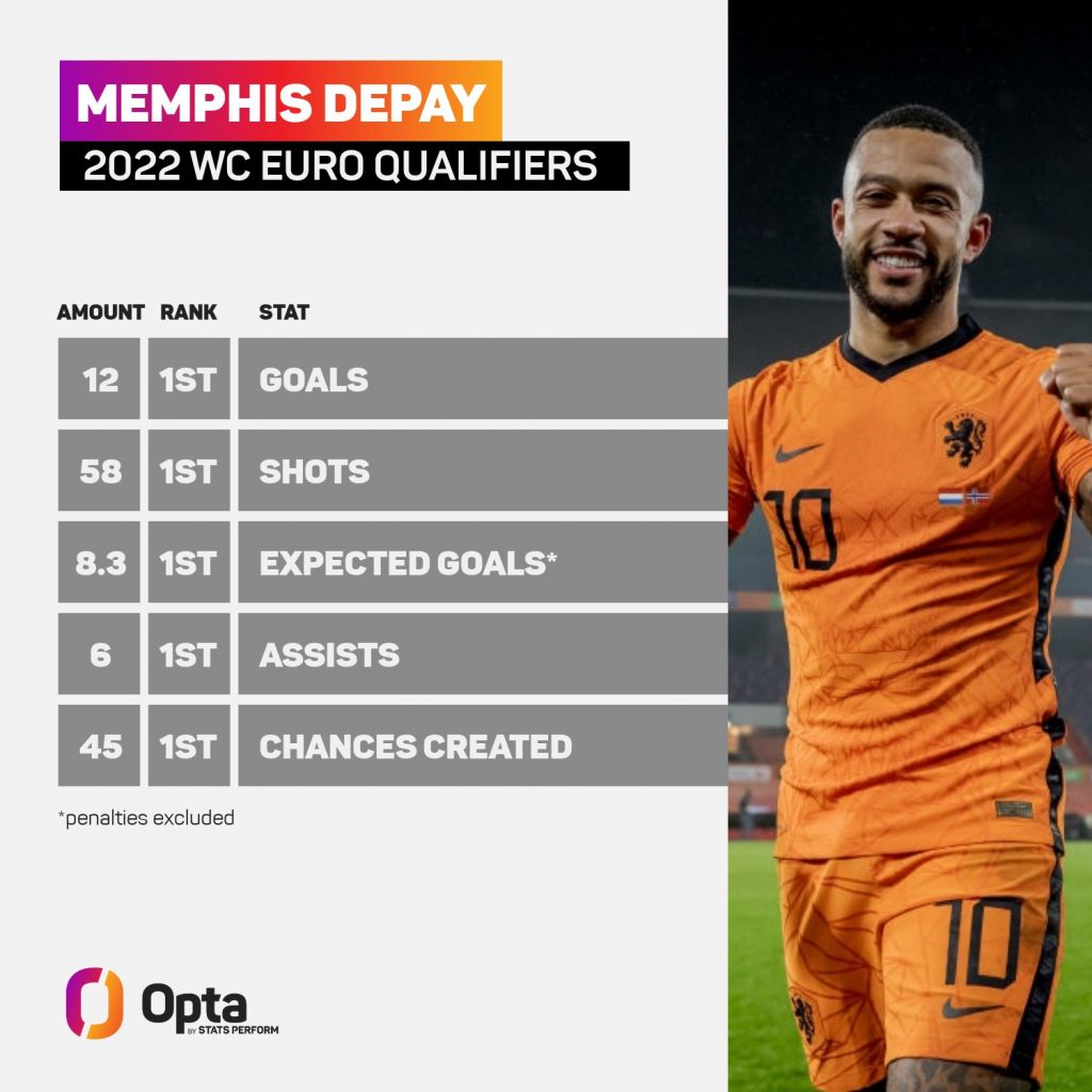Depay rúgta a legtöbb gólt, adta a legtöbb gólpasszt és alakította ki a legtöbb helyzetet a 2022-es világbajnokság selejtezőjében.