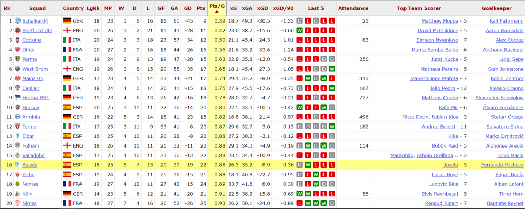 Egy Reddit-felhasználó összeszedte, hogy melyek az öt európai topliga leggyengébb csapatai az idei szezonban a megszerzett pontok alapján. Nem meglepetés, hogy az idényben mindössze egy meccset nyerő Schalke az első, a gelsenkircheni csapat meccsenként mindössze 0,39 pontot szerez. A listán a második a Sheffield United, a Crotone pedig a harmadik. A kilencedik helyen Dárdai Pál csapata a Hertha, a berlini klub meccsenként 0,78 pontot szerzett eddig a bajnokságban, a kiesés ellen küzd jelenleg. A Hertha a hétvégén a Wolfsburgtól kapott ki, az előző kilenc meccséből egyet sem tudott megnyerni.