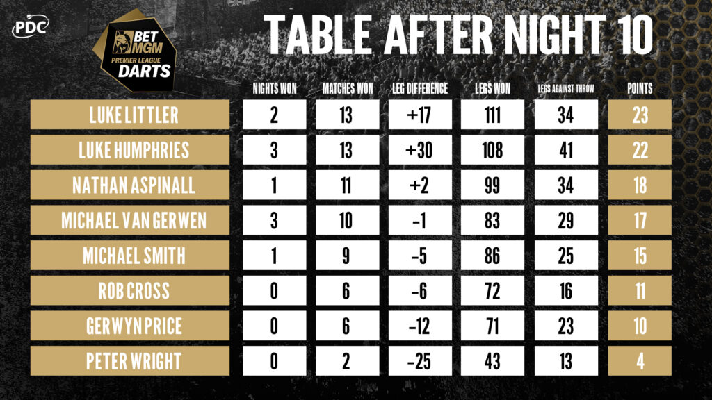 A darts Premier League 10. állomását Luke Littler nyerte, a fiatal angol ezzel zsinórban a második PL-fordulót húzta be, és összesítésben is átvette a vezetést.