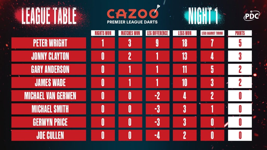 A megújult Premier League-ben most már minden állomáson győztest hirdetnek. A friss kétszeres világbajnok, Peter Wright és Jonny Clayton játszotta az első kör döntőjét, miután a skót Michael Smith és Gary Anderson, míg Clayton Joe Cullen és James Wade ellen nyert.