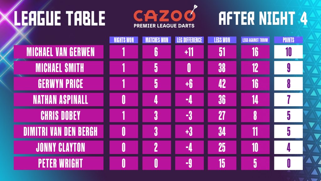 A darts Premier League negyedik fordulójában két korábbi világbajnok, Michael van Gerwen és Gerwyn Price játszotta Dublinban a döntőt. A walesi 5–2-re is vezetett, meccsnyilai voltak, de Van Gerwen visszajött 5–5-re. A döntőlegben Price-nak öt lehetősége is volt arra, hogy befejezze a meccset, de az összes meccsnyilát kihagyta. Van Gerwen is megküzdött a végén a kiszállókkal, de végül egy dupla néggyel lezárta a meccset, megnyerte a döntőt.