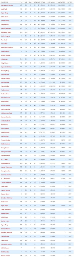 A Super Bowlt nyerő csapat legjobban kereső játékosa a teljes szerződés időtartamát nézve Demaryius Thomas, a 28 éves elkapónak 5 éves szerződést toltak az orra alá, amely 70 millió dollárról szólt. 2020-ig írt alá. Ez ugye éves szinten 14 millió, Peyton Manningnek viszont természetesen ennél magasabb, ő évi 17 milliót kap(ott), de mivel csak kétéves volt a kontraktusa, ezért látható lejjebb a neve.