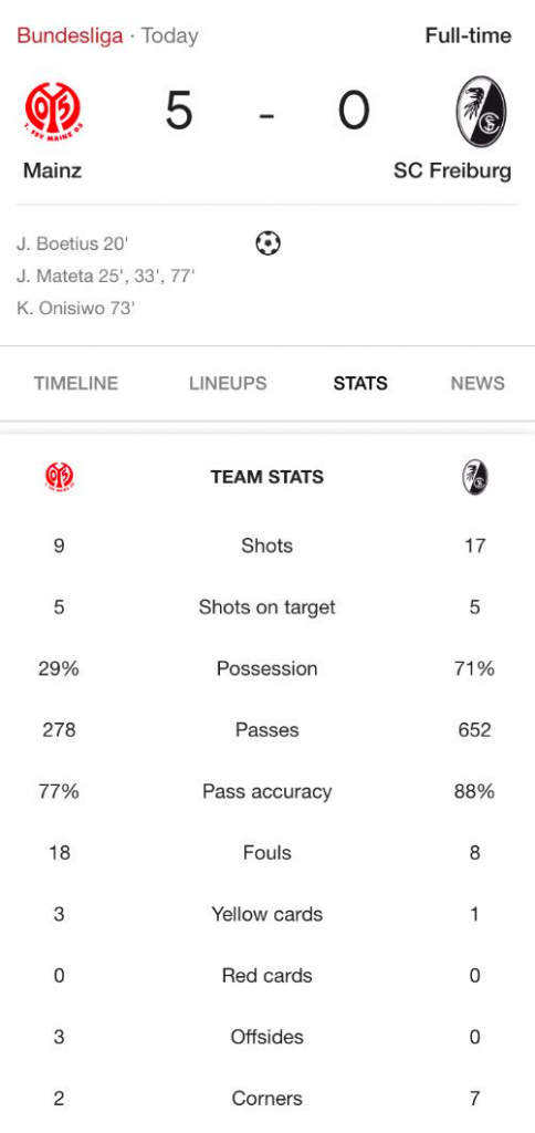 A Mainz úgy verte 5–0-ra a Freiburgot a Bundesligában, hogy gyakorlatilag minden statisztikai mutatóban a Freiburg volt a jobb.