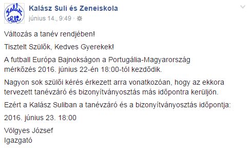Egy budakalászi általános iskola, a Kalász Suli és Zeneiskola a Facebook-oldalán közölte, hogy a válogatott miatt megváltoztatják a tanévzáró időpontját.