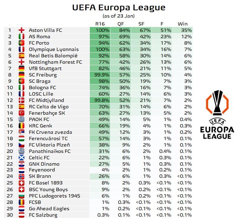 A Football Meets Data szerint jelenleg 35 százalékkal az Aston Villának van a legnagyobb esélye megnyerni az Európa-ligát.