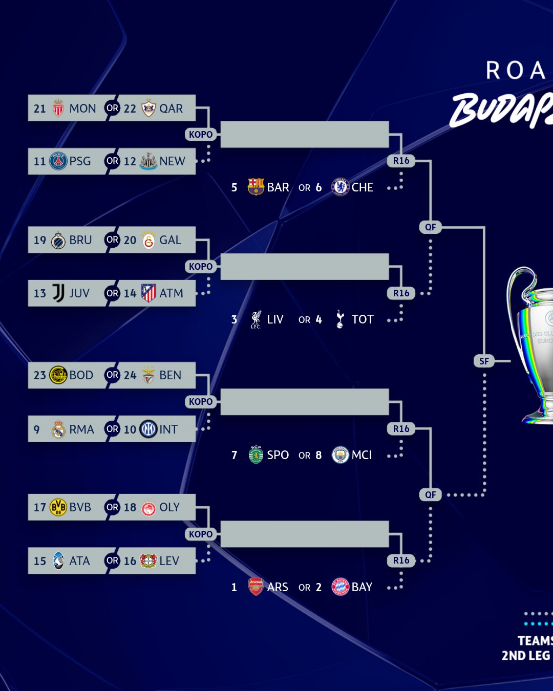 Pénteken tartják a következő kör sorsolását, az ágrajz azonban már ismert. Ez alapján a PSG és a Newcastle kiemelt lesz, a Monaco és a Qarabag viszont nem. Az ebből a négyesből továbbjutó két csapat a Barcelonát és a Chelsea-t kaphatja.