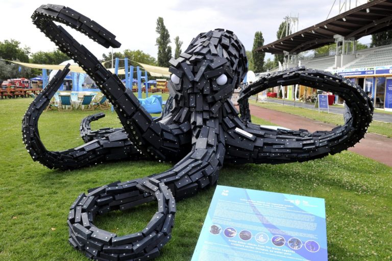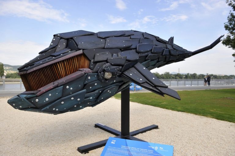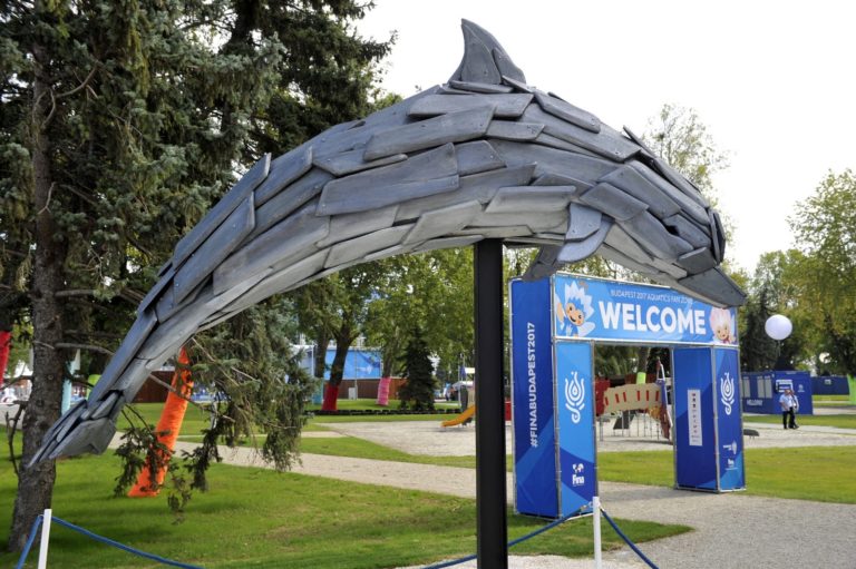 Ezek a köztéri szobrok a sportágakat szimbolizálják, annak a Szőke Gábor Miklósnak az alkotásai, aki a Fradi-sast és Atlanta Falcons sólymát is tervezte. Az úszást a cápa, a nyíltvízi úszást a bálna, a műugrást a delfin, az óriás-toronyugrást az orka, a szinkronúszást egy halraj, míg a vízilabdát a polip szimbolizálja