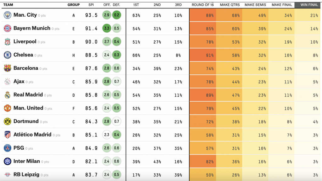 A FiveThirtyEight BL-esélyei a 2021-2022-es Bajnokok Ligája-idényre: