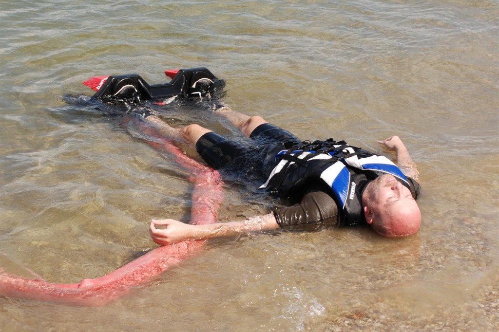 Miután behúztam a méretes vörös csodát Zsolttal együtt, hasra kellett feküdni, majd felállni a vízben, magam alá gyűrve a csövet, kötéssel együtt. Az egész mókában ez a legnehezebb, nem csak fizikailag, hanem koordinációs szempontból is, víz alatt állni, de nem a talajon, nem könnyű egy cuccal a lábadon. Aztán jeleztem, ha oké, a főnök meghúzta a gázt, irány az ég.