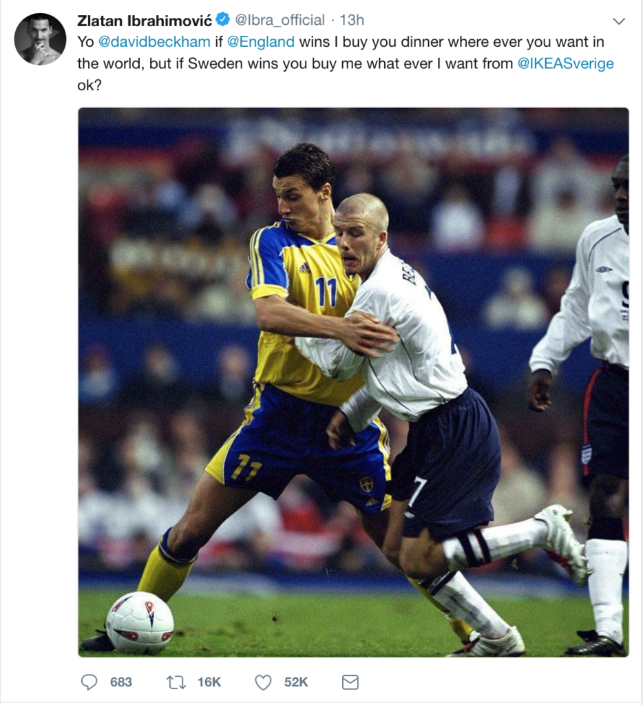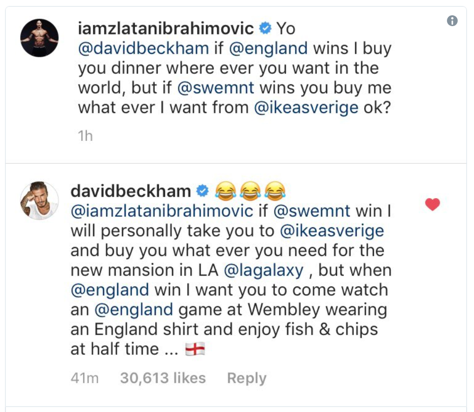 Zlatan: "David, ha Anglia nyer, vendégem vagy egy ebédre, bárhol a világon, ahol csak akarod. Ha mi nyerünk, akkor pedig megveszed nekem az Ikeából, amit csak szeretnék!”